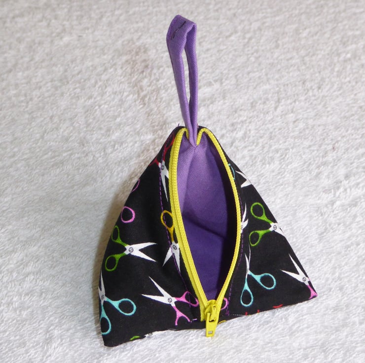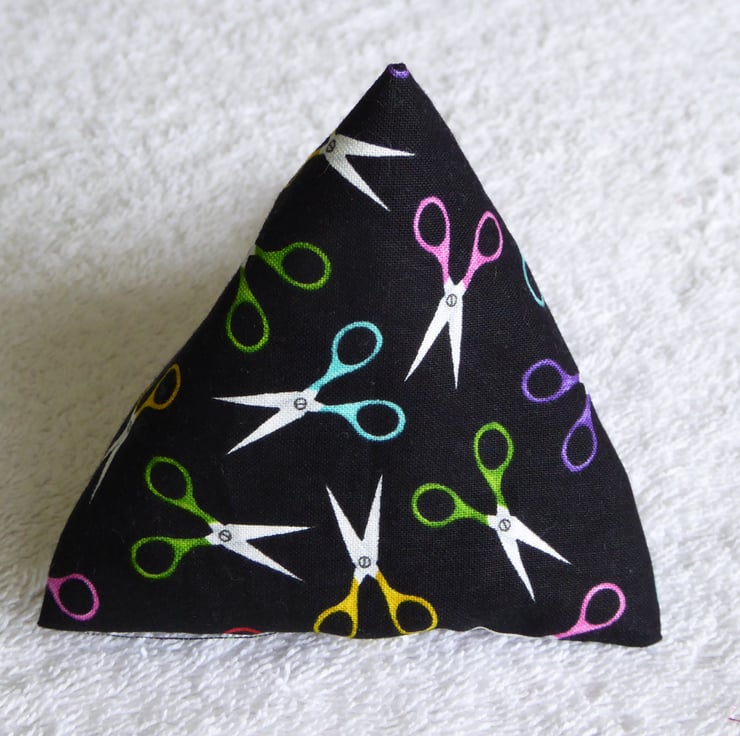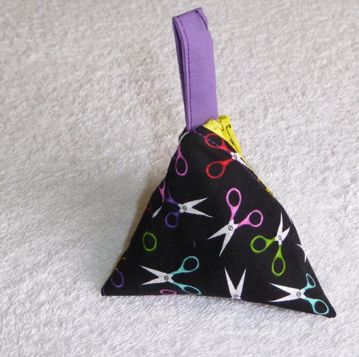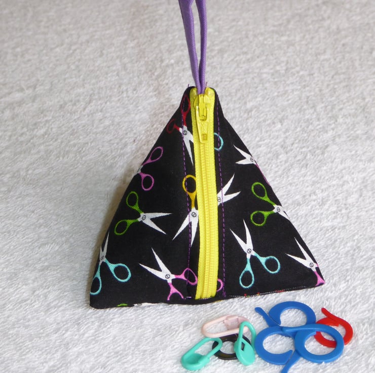 I have created this fascinating 3 dimensional 100% cotton fabric pyramid holder for little bits and bobs such as knitting stitch markers.