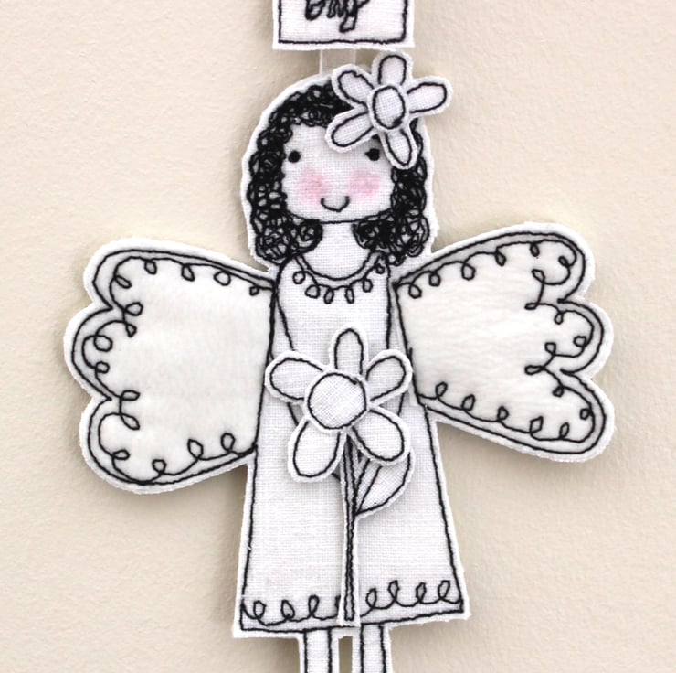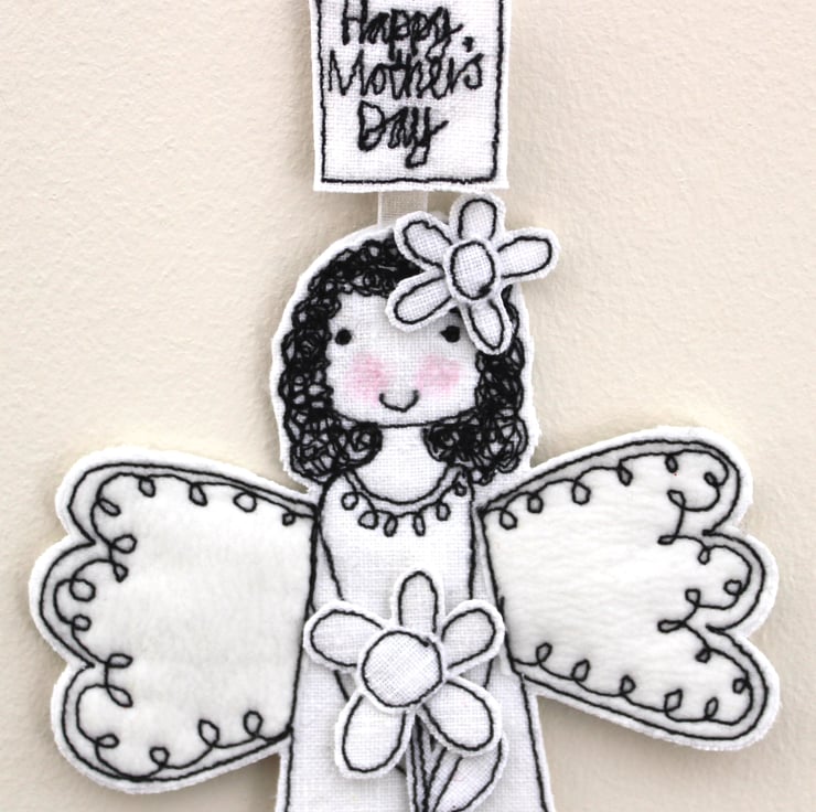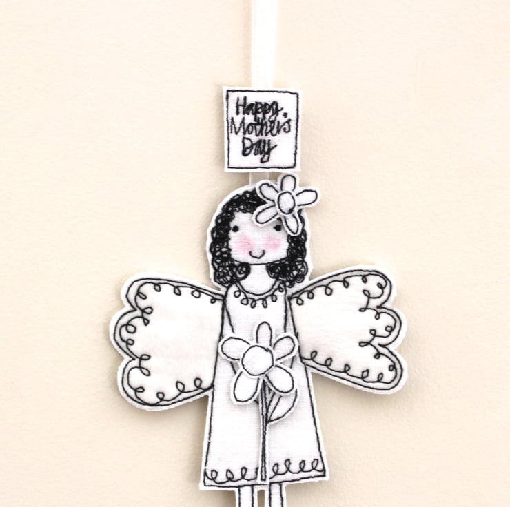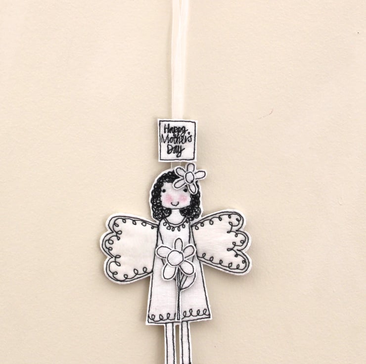 Meet this special little fairy, she wears a flower in her hair, is holding a flower and has a sewn fabric label above her head'Happy Mother's Day'.
