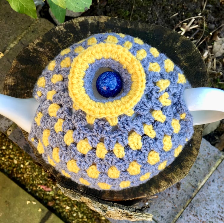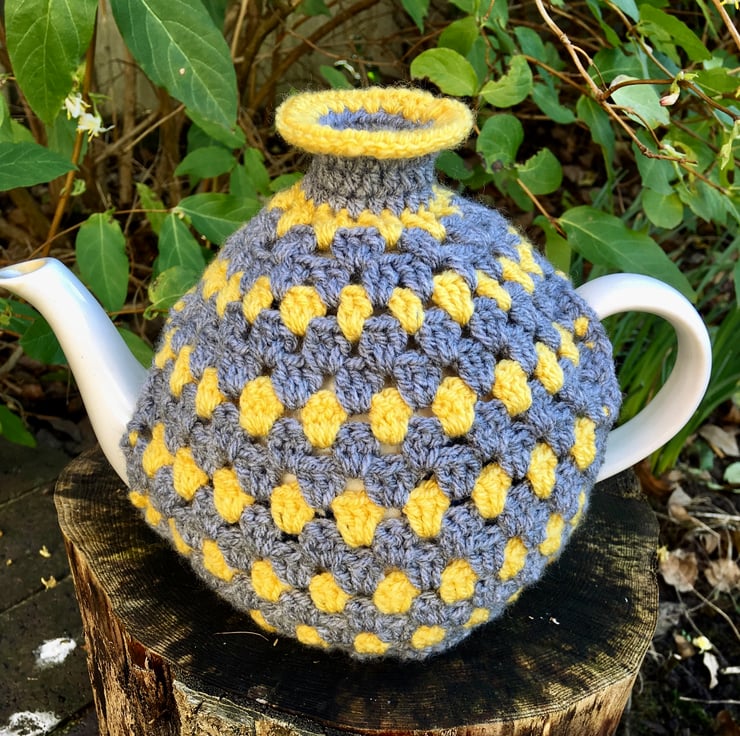 Decorate your home with this modern granny stripe grey and yellow tea cosy.