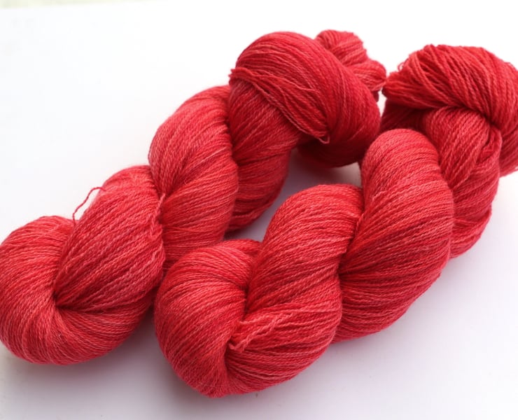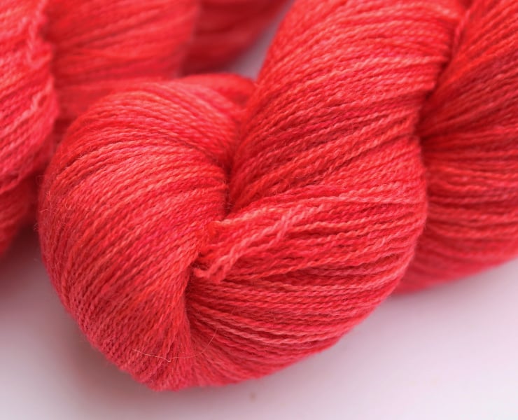 Semi-solid/subtley variegated vibrant bright red- pinks, in watermelon, dark coral and strawberry shades.. This lustrous, lofty, soft yarn should make beautiful lace projects. There are two skeins available (price shown is for one). Photographs have been taken and edited in bright natural light (second photo is probably more accurate for colour).