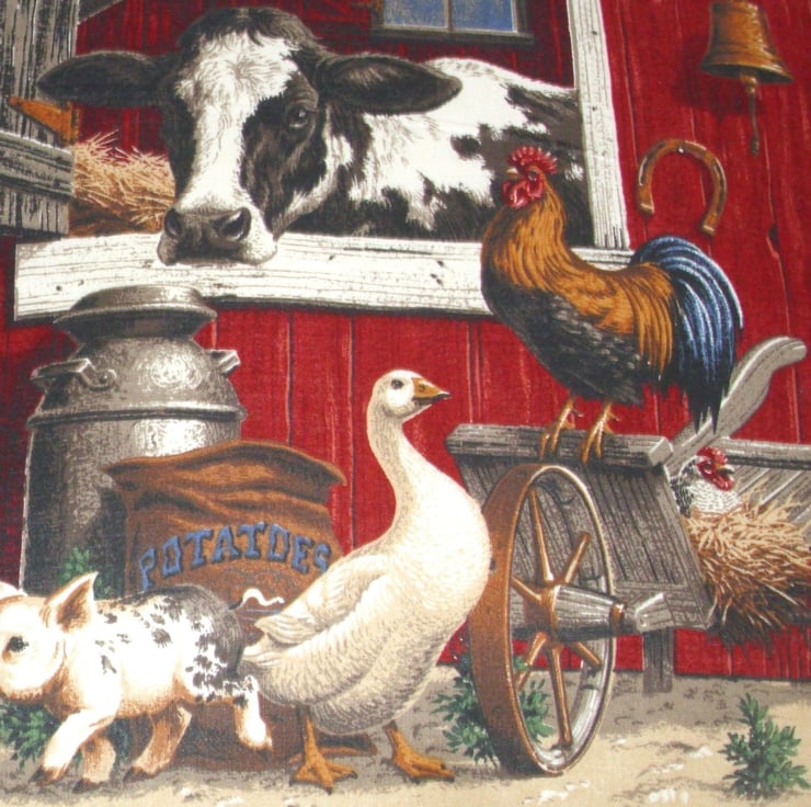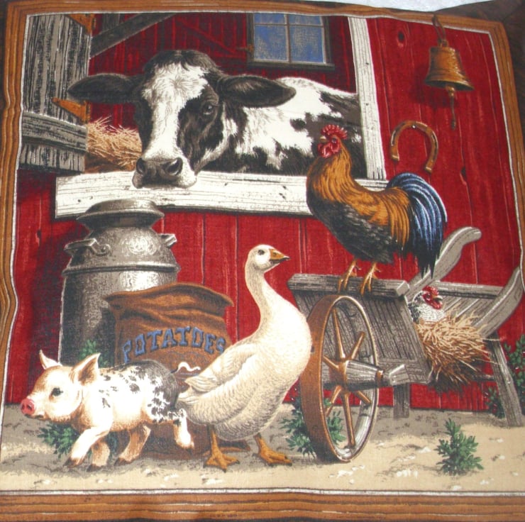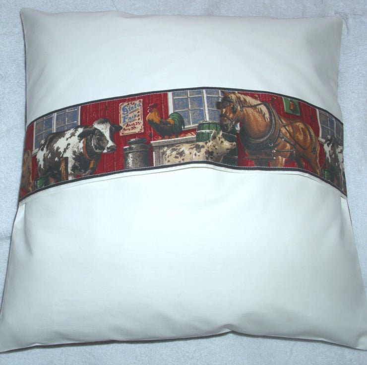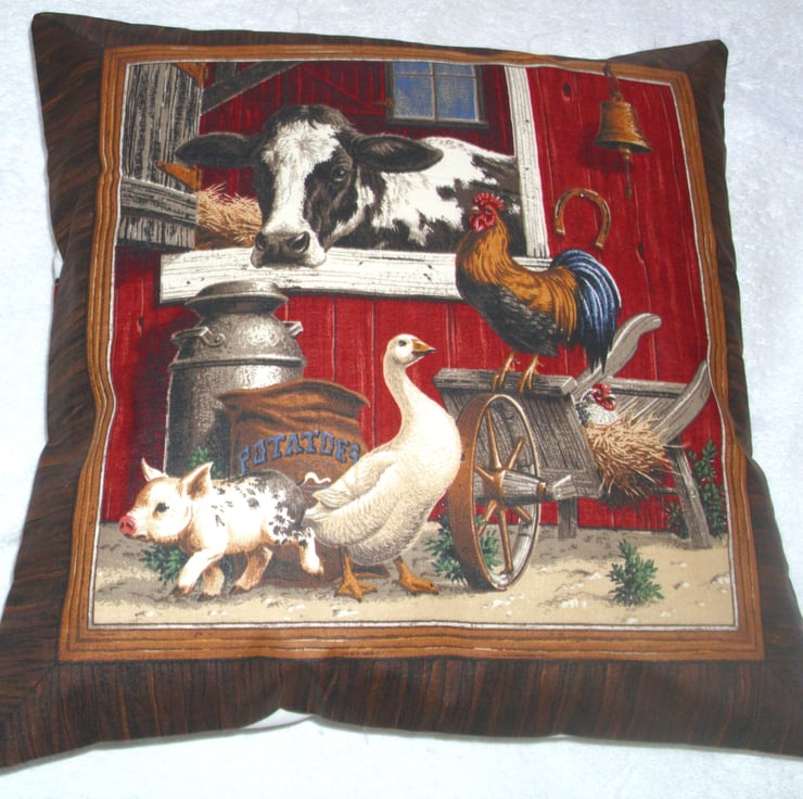A square cushion with a Lovely friesian cow looking out the window with a piglet, cockerel, goose and a hen sitting on a wheelbarrow with a brass bell hanging on the wall and a sack of potatoes leaning against a milk churn in front of the barn. would look good in any lounge, sitting room, study or office on any settee or armchair or in a conservatory or summer house or on a bed.