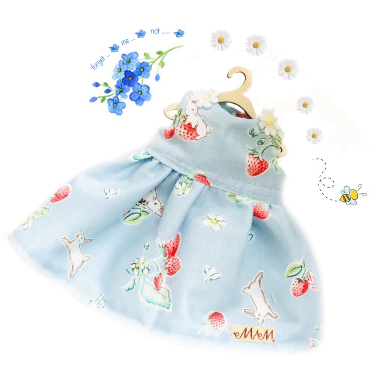A gorgeous little pale blue cotton dress printed with rabbits and strawberries to fit the Mulberry Green characters. The dress has a full skirt and a lined bodice and is decorated with two sweet ltttle daisies on the shoulders. It comes on a cute little wooden hanger.