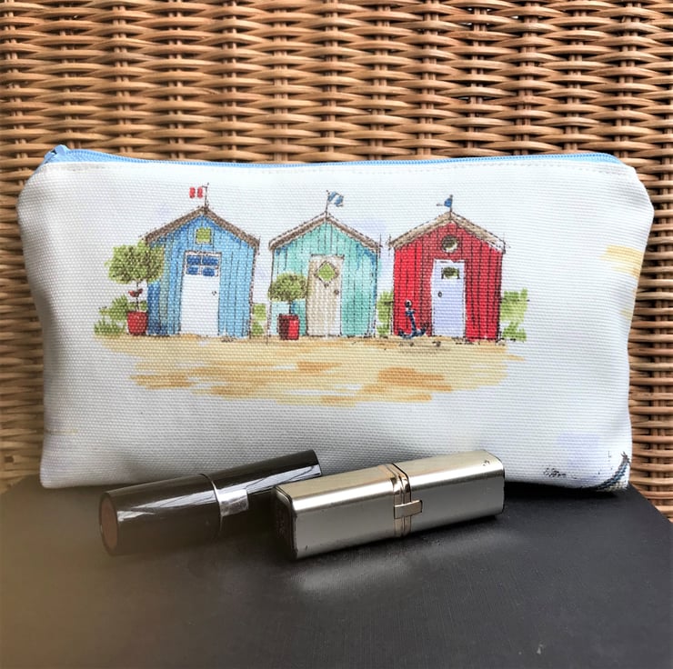 A summery cosmetic bag in cream fabric with a lovely print pattern featuring three beach huts. The colours are typically coastal in shades of blue, turquoise, golden yellow, green and red. The make up bag fastens with a co-ordinating pale blue zip and is lined with cream fabric. The base of the bag is boxed giving lots of space inside.