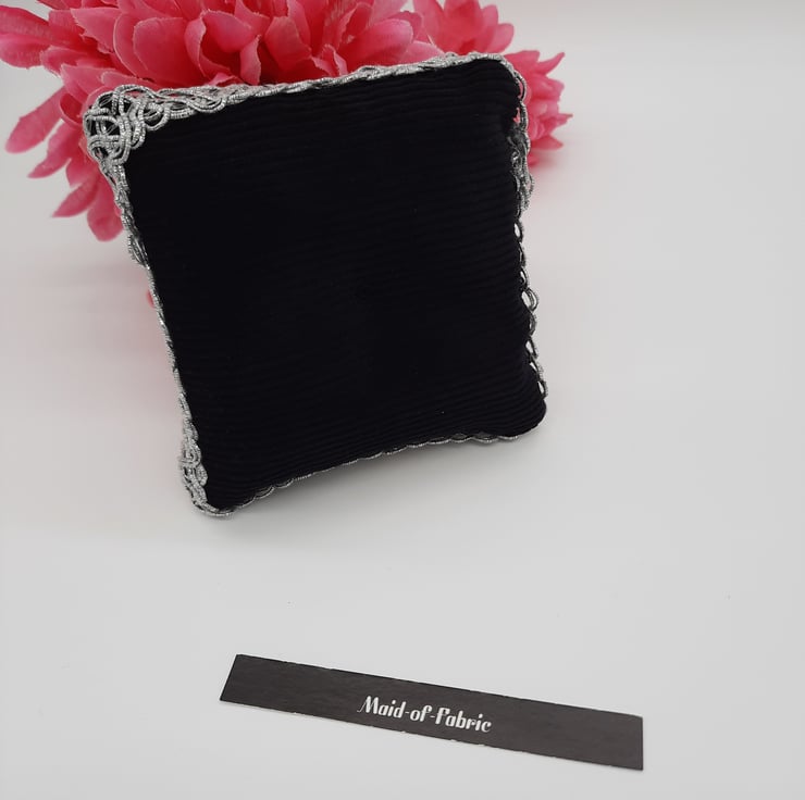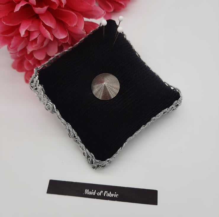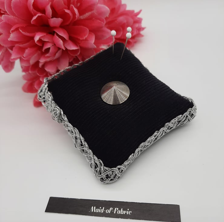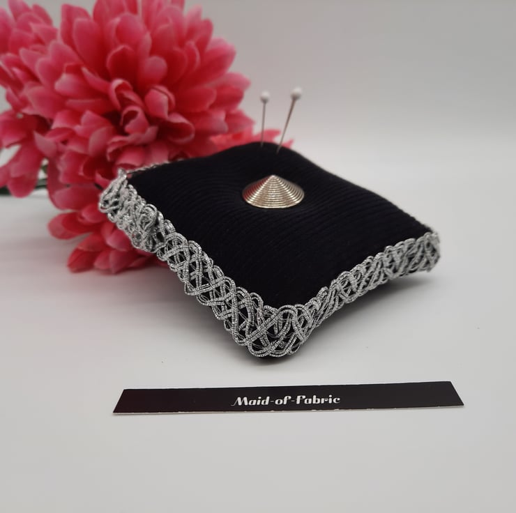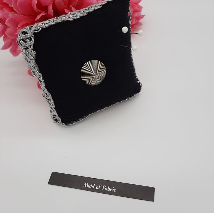 Filled with synthetic stuffing and has a sheet of buckram inside so the pins will not go all the way through.