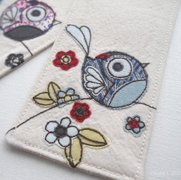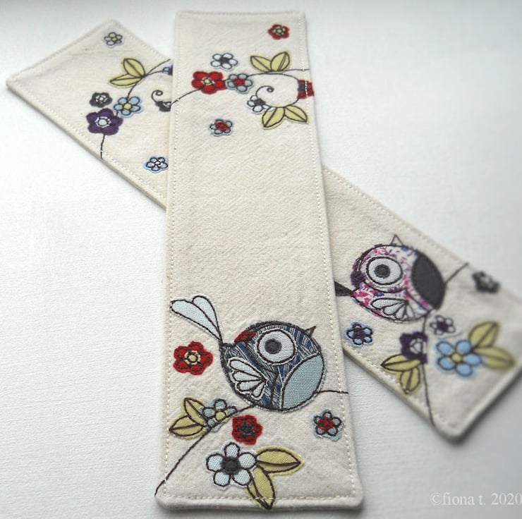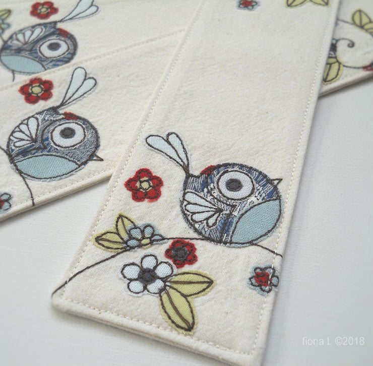 these bookmarks are made up with heavy weight calico, stiffened with interfacing, and the edges are neatly top stitched.
