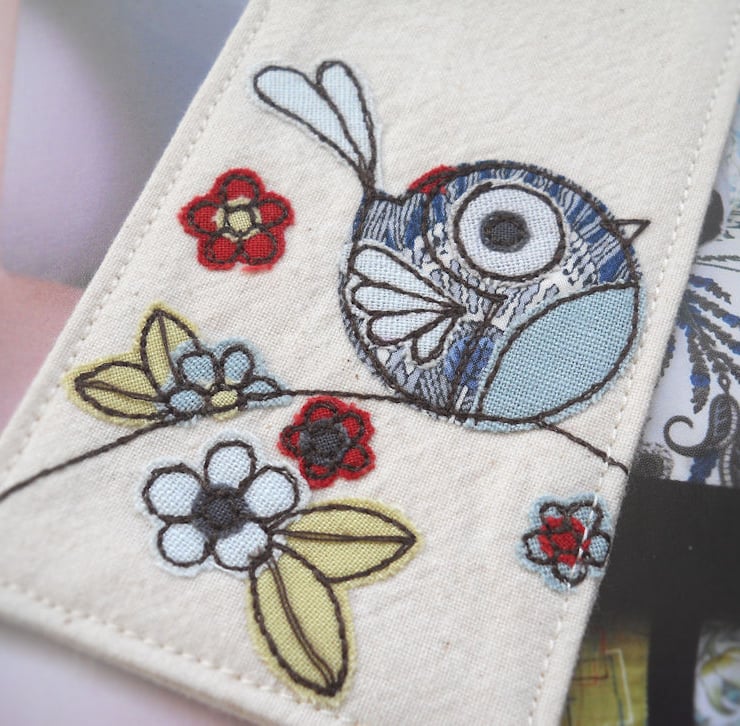 cute blue bird embroidered fabric bookmark.