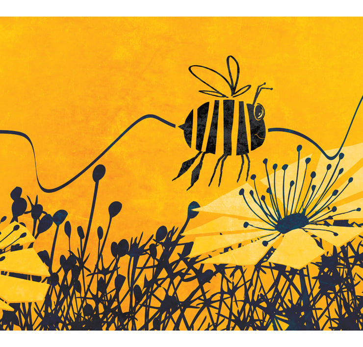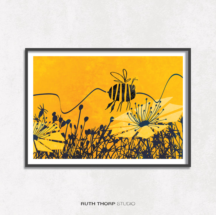 A bright happy bee print that would be perfect to brighten the walls of a child's bedroom.