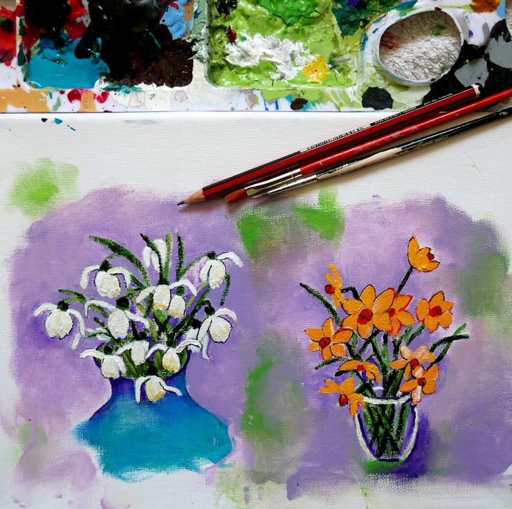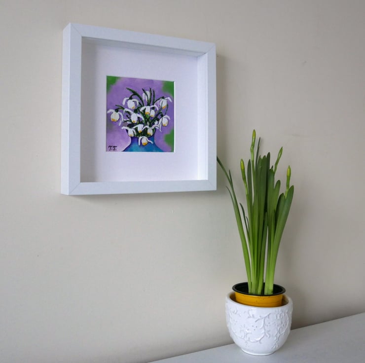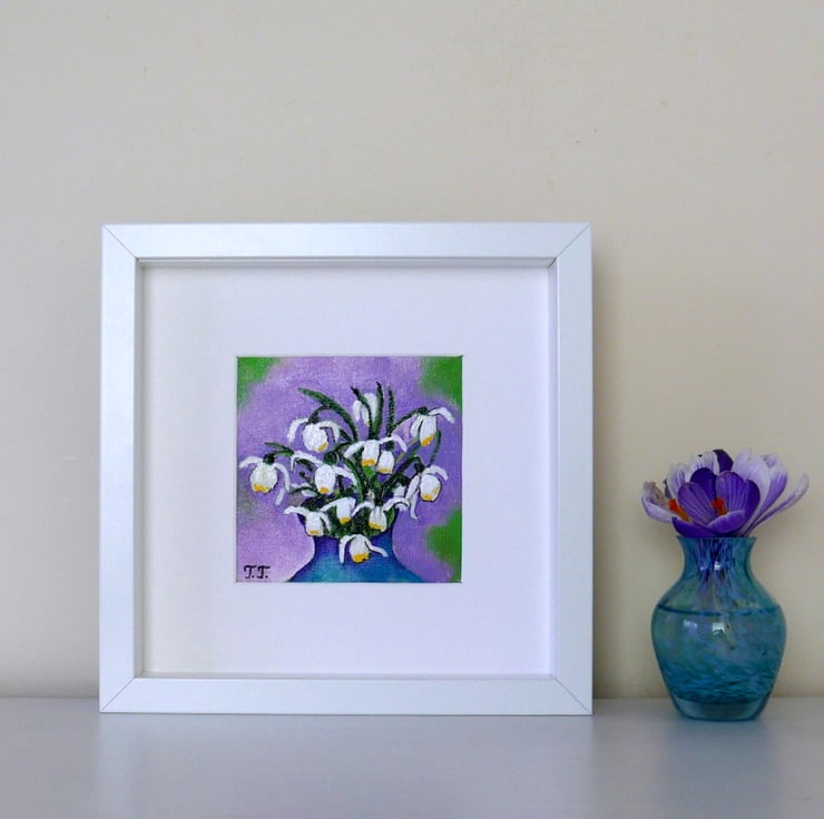 This is an original painting created on canvas linen, mounted and framed. It features a snowdrop bouquet in a blue-purple vase against a purple and green background. The white snowdrops stand out beautifully and they really complement the white frame. The artwork is approx 4.75" x 4.75" and the frame is 10" x 10". The floral painting is varnished for protection and ready to hang. It is perfect for Mothers Day gift as these snowdrops will live forever.