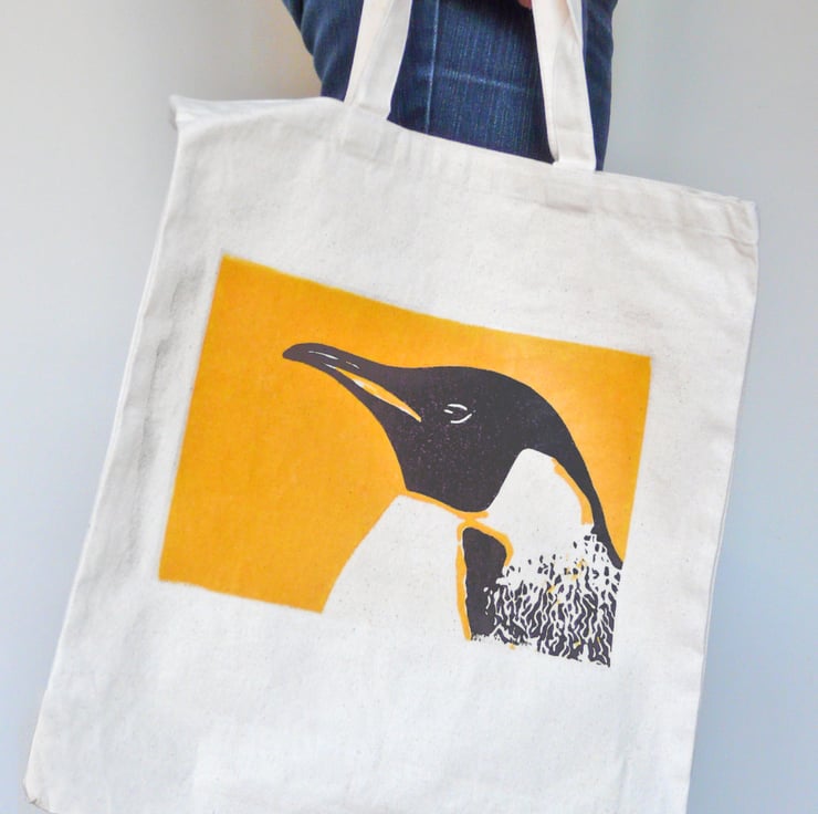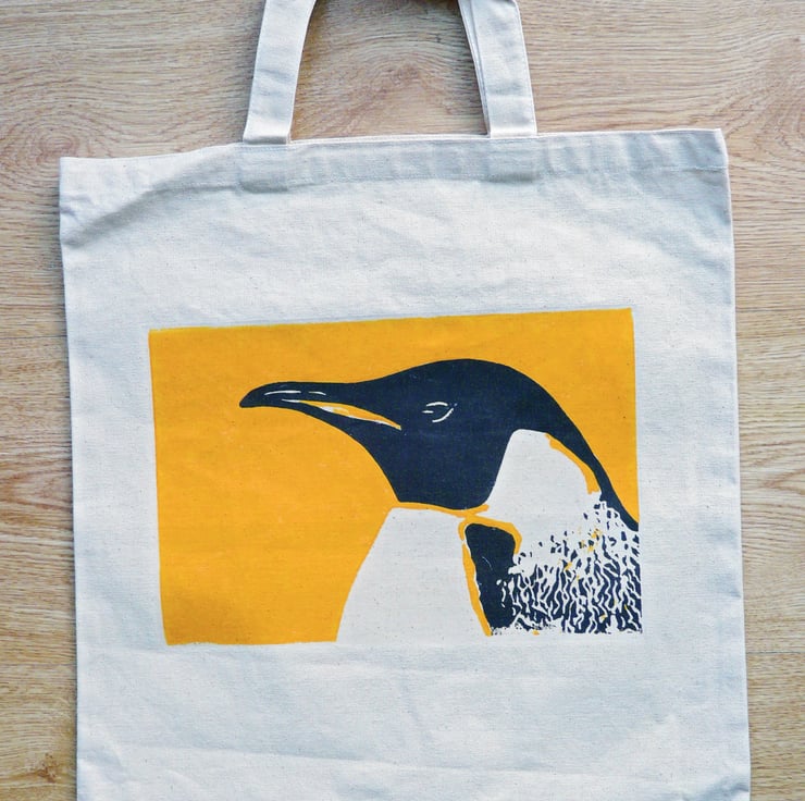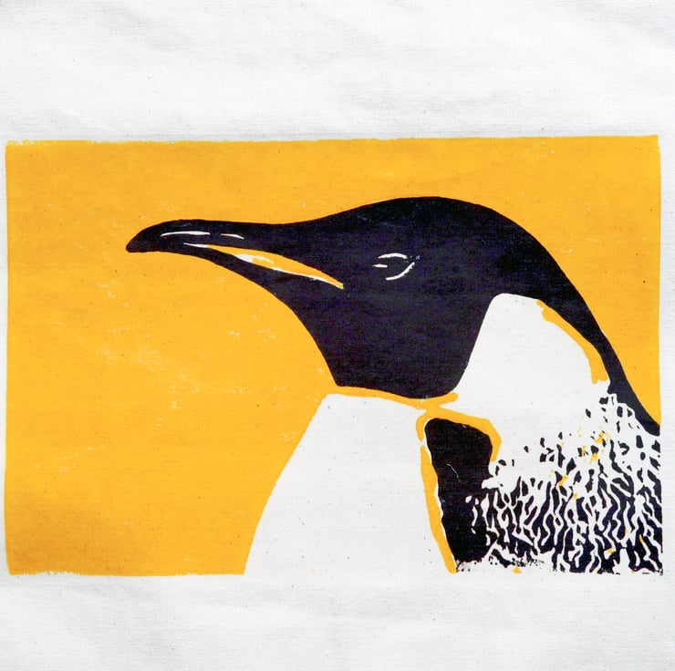 The image is a high quality digital scan of one of my original linocut prints that has been heat transferred onto one side of the bag. The printed image is approx. A4 in size.