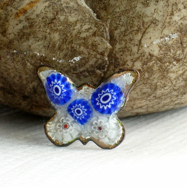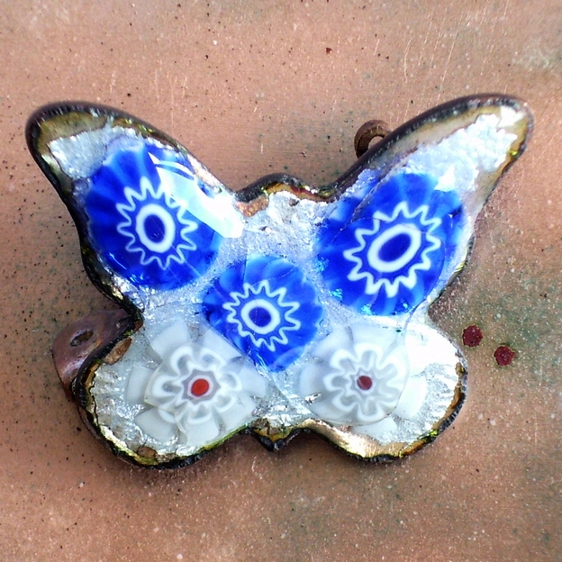 After building up a base of clear enamel on the copper shape I have added a layer of silver foil, secured with a layer of clear enamel. On this I have placed five millefiore beads and fired them to the butterfly shape.