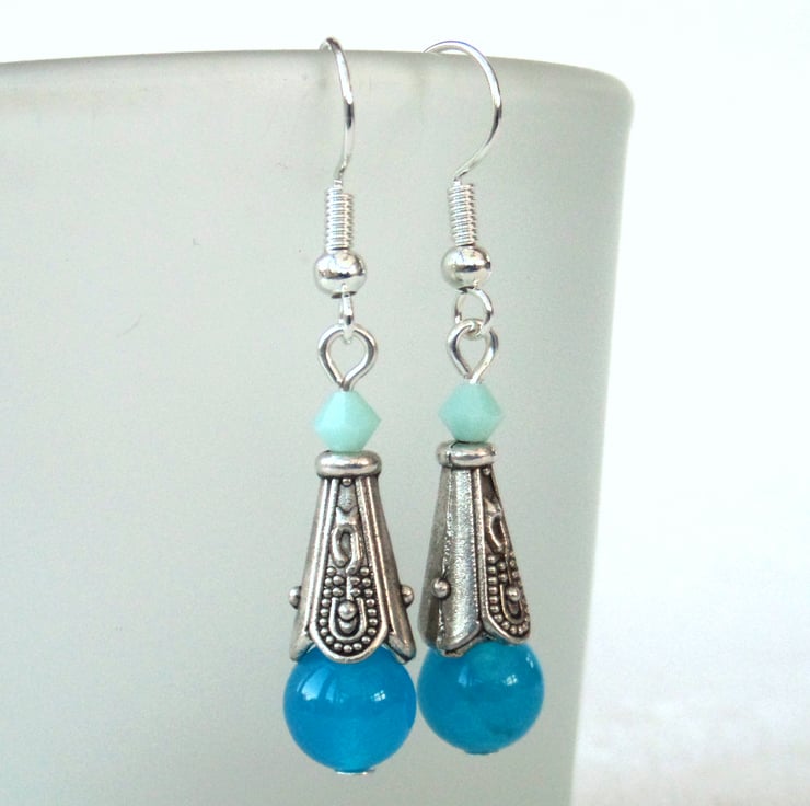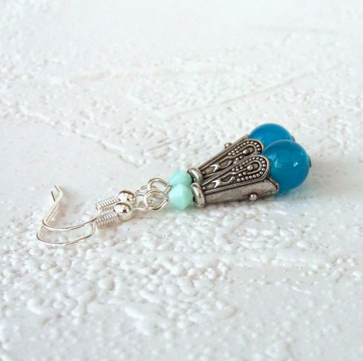 A lovely shade of jade, in a vibrant blue, hang with tibetan silver elongated beadcaps and a lovely mint green Swarovski® crystal.