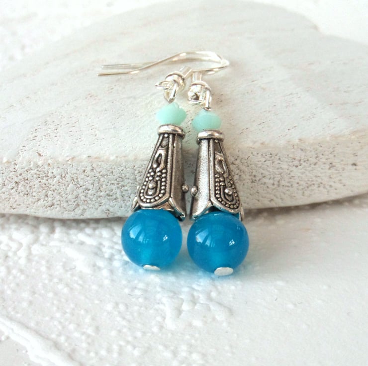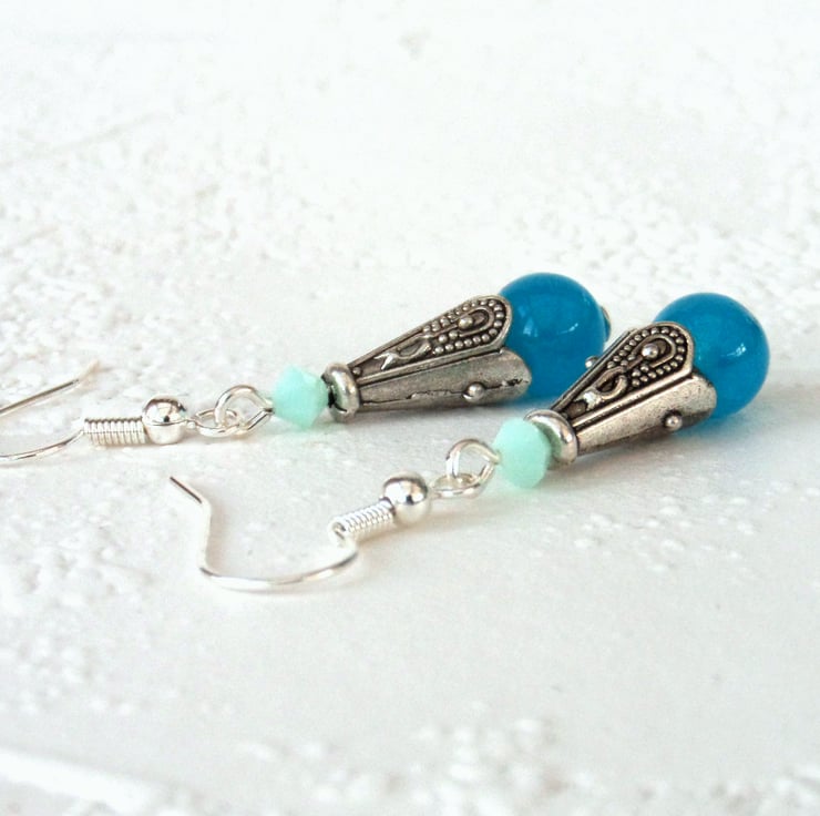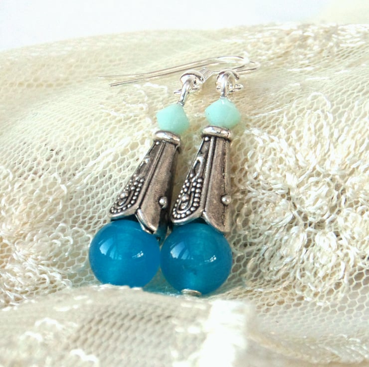The tibetan silver beadcaps add real character and interest to these earrings - they are very ornate, this a gorgeous pattern that gives them something of an oriental style.