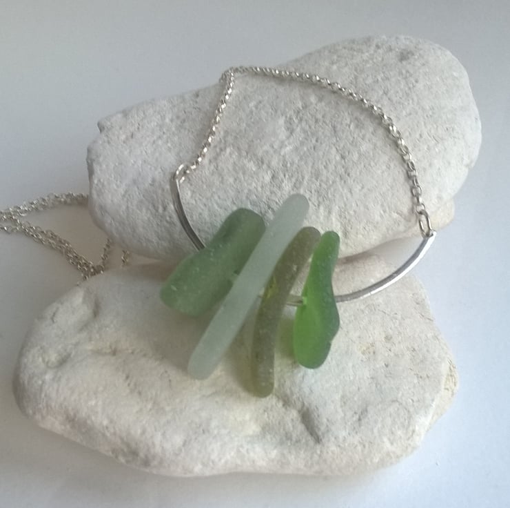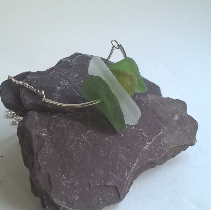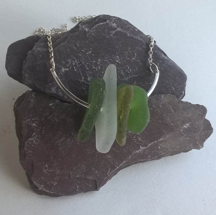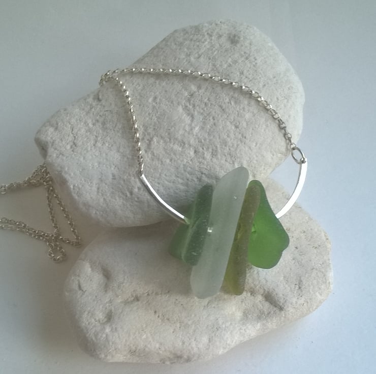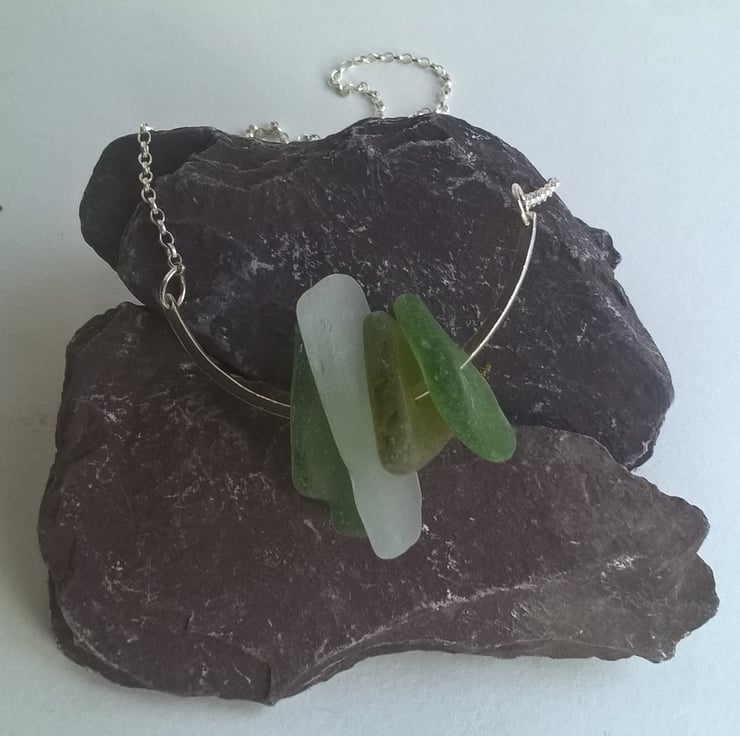 A necklace made of large pieces of sea glass in greens and white. A hole is drilled in the middle of each piece of glass so a 6 cm length of silver is threaded through them. The silver is formed into a 'smile' with a belcher chain attached to each end.