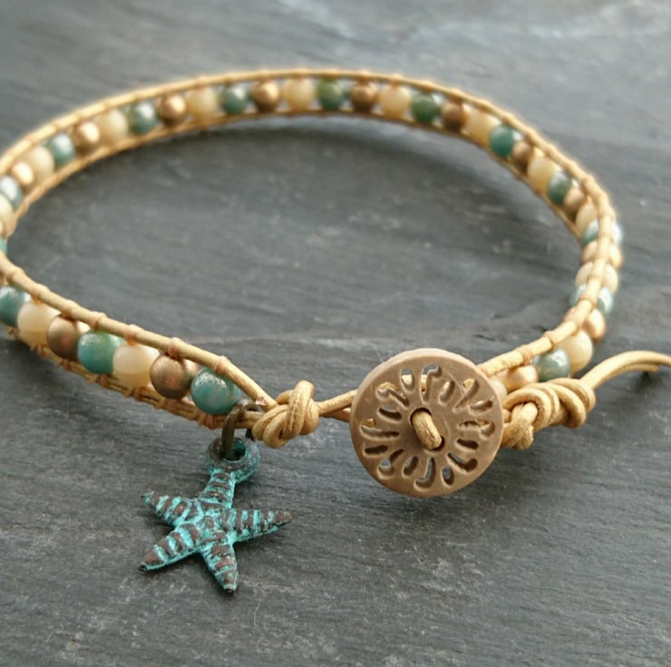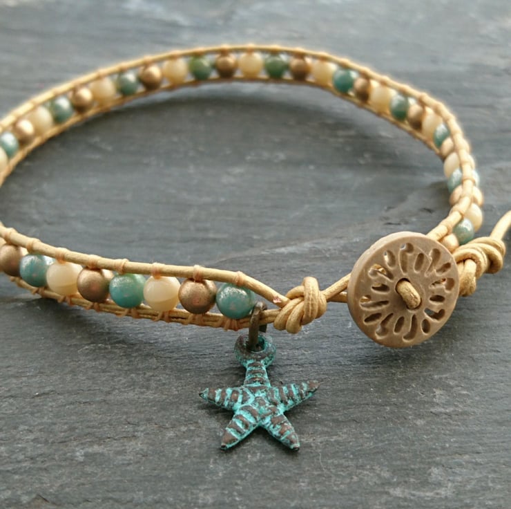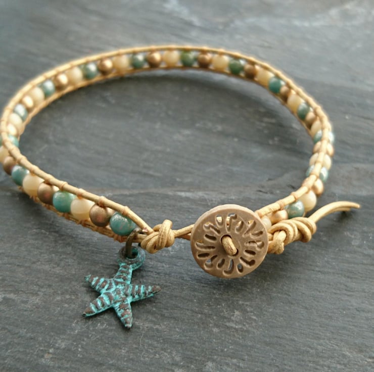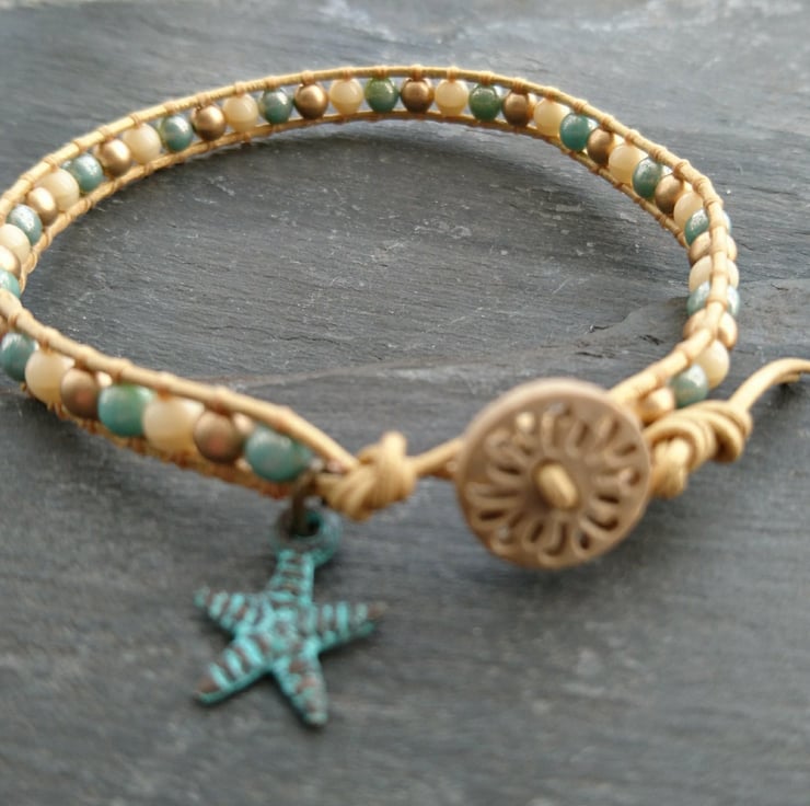 This delicate bracelet has been made with soft leather cord in a lovely metallic gold. Small round glass beads in cream, gold and blue have been attached to it. A carved wooden button has been used as a fastener and a little starfish charm adds the finishing touch.