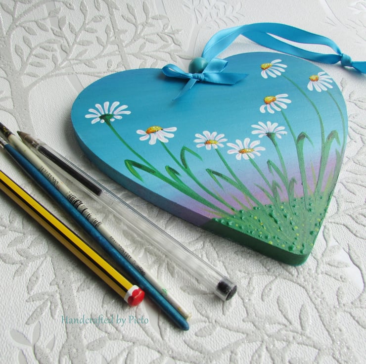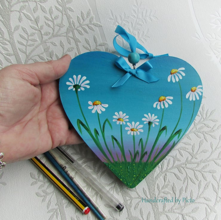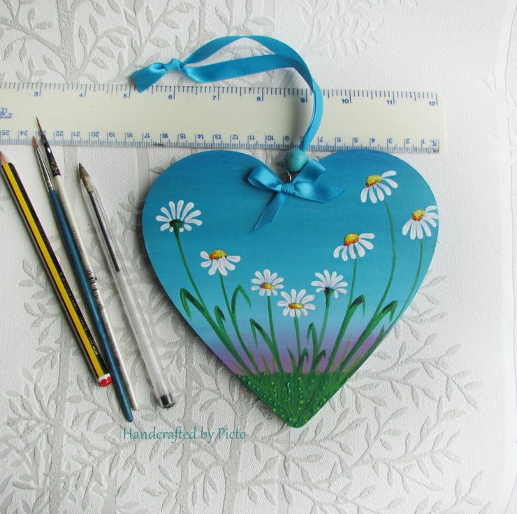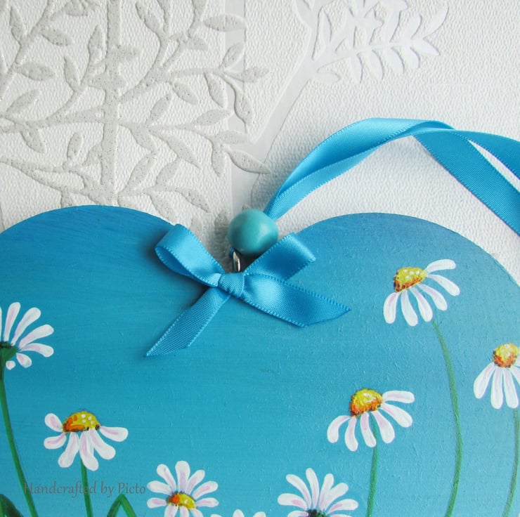 This Large Hanging Heart has Daisies handpainted onto a Pink & Turquoise background.