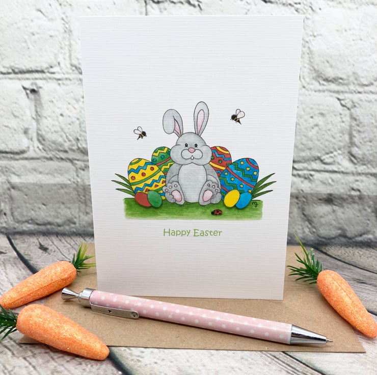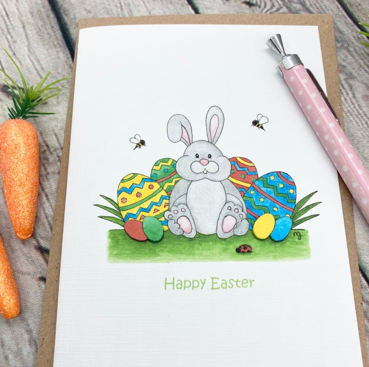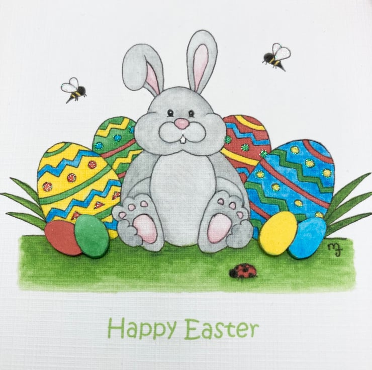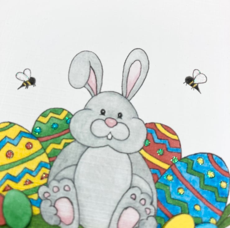 This cute Easter bunny card has been designed using my own original illustration. The image has been printed out onto good quality white linen embossed card and decoupaged up in parts. I have also added a little glitter detail.