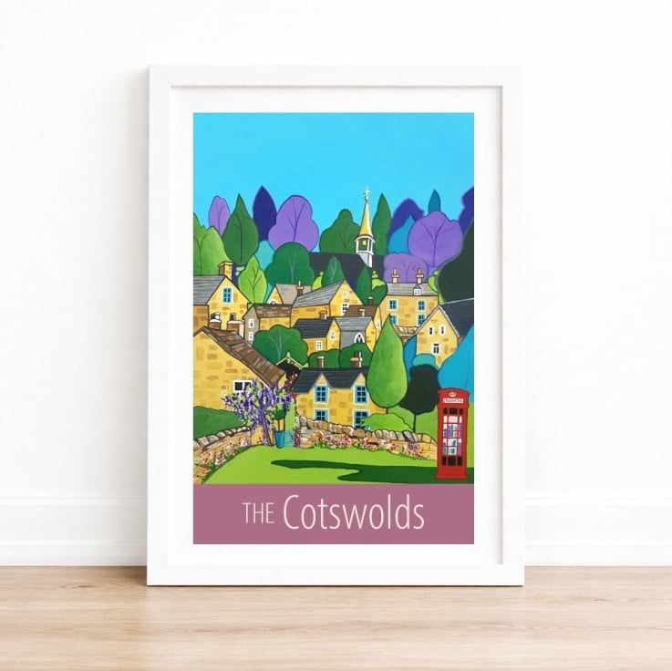 A contemporary travel poster style print of the beautiful Cotswolds, from my own original acrylic painting. A perfect gift for those who love the Cotswolds!