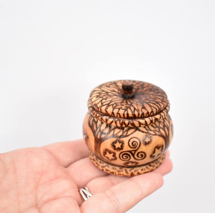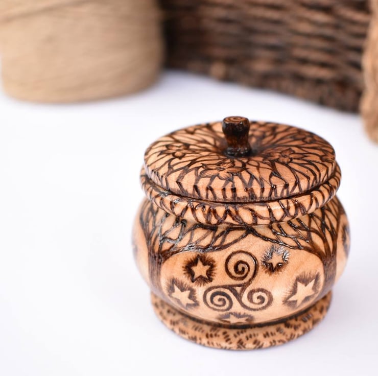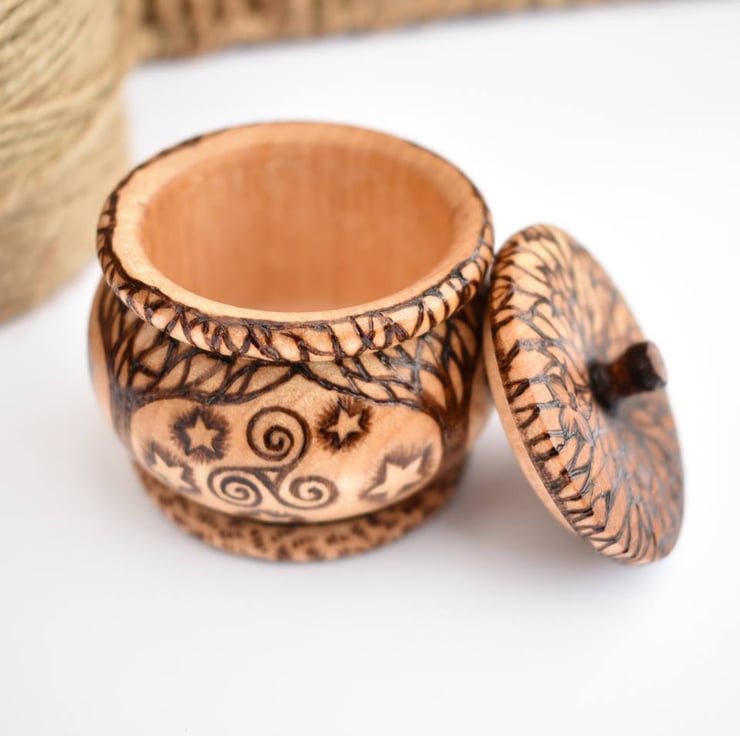This is a beautiful and unique little trinket pot with a tree of life design hand burned into the wood using pyrography. It features 4 intertwined trees, a goddess symbol, a triquetra, a triskele, and moon phases. It would be a lovely wood anniversary gift (5 years marriage).