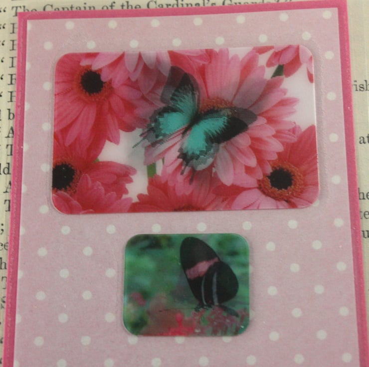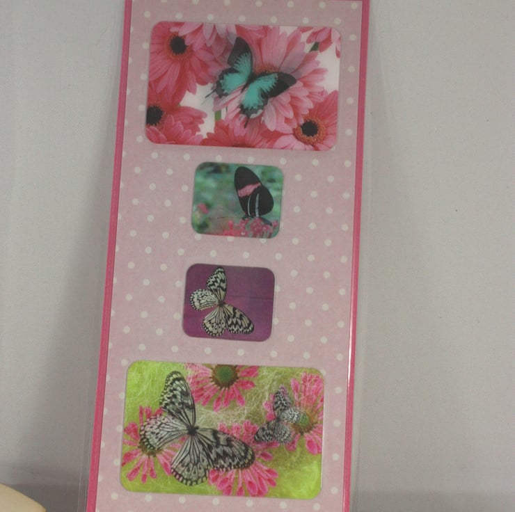 Pink bookmark created using lenticular butterfly images. The images change as you move the bookmark. The 4 images are layered over pink and white polka dot card on a bright pink background.