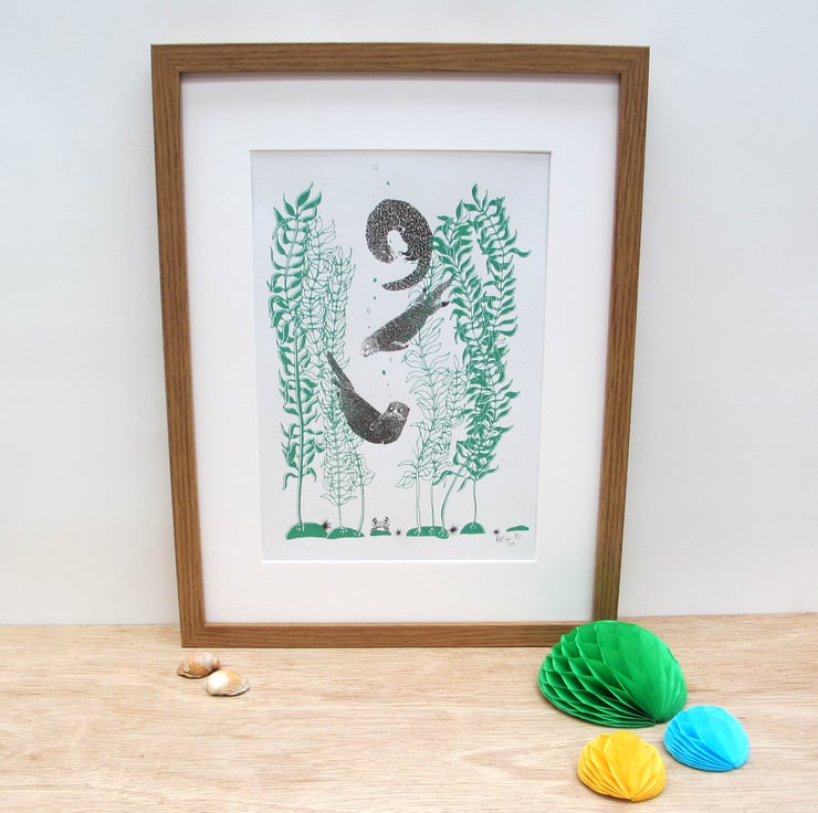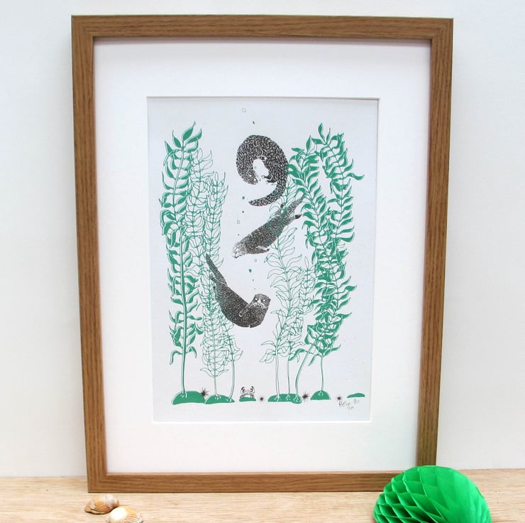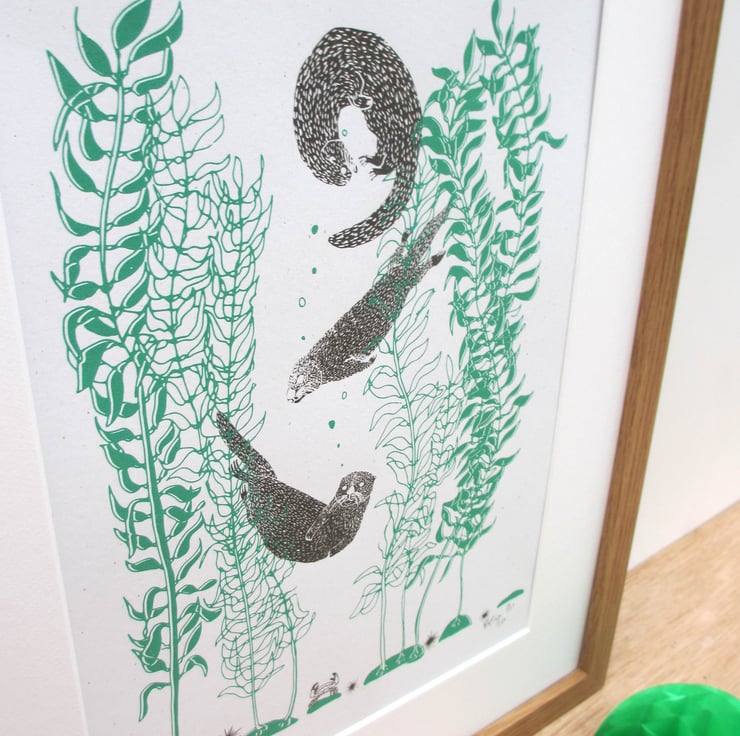 'Otters and kelp' has been lovingly designed and hand printed in an edition of x100. Each signed and numbered by the artist (me!). Hand screen printed in Bristol by Beth from Boodle.