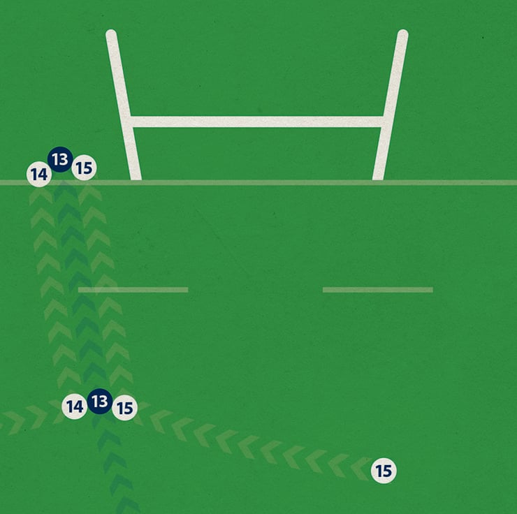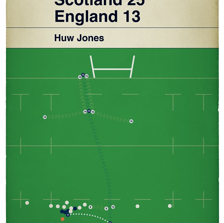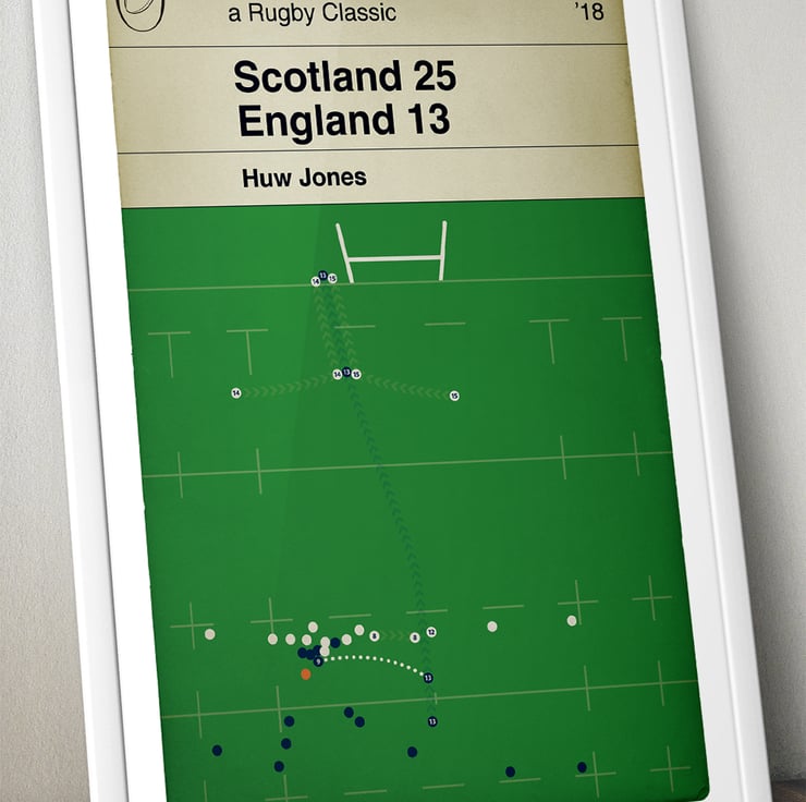 This edition illustrates Scotland's stunning third try against the Auld Enemy at Murrayfield in the 2018 Six Nations championship. The try showcased the power and pace of the young Scottish centre Huw Jones. Jones took the ball from scrum-half Greig Laidlaw's low pass near the halfway line and burst between Owen Farrell and Nathan Hughes before sprinting away. As he neared the try line he was tackled by Anthony Watson and Mike Brown but dragged both Englishman over the line with him for a sensational score. The Scots were 22 - 6 up before half time and a first win against England in 10 years was looking likely. The final score was 25 - 13 and the Calcutta Cup was Scotland's once again!