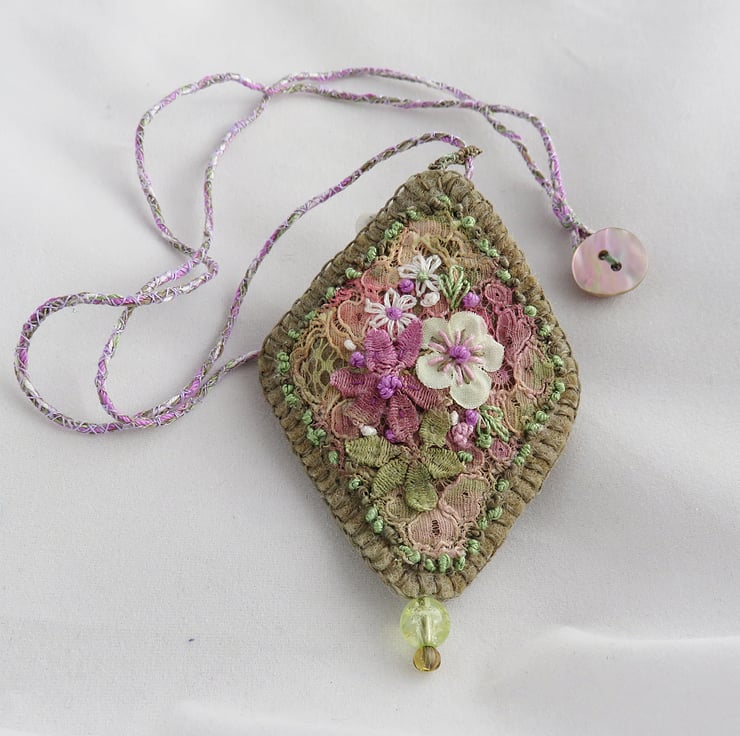 Hand-dyed antique lace, felt and silk flowers in shades of lilac, cream and green, were the starting point for this pretty pendant which has been hand-embroidered in coordinating threads and hangs from a matching, hand-made cord.
