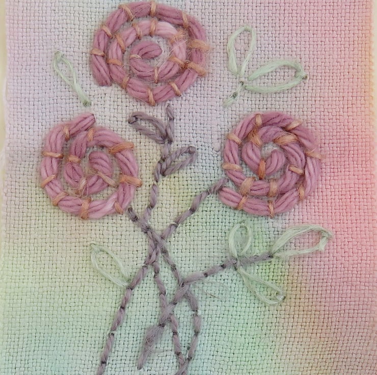 A simple rose bouquet has been hand-stitched onto a hand-dyed fragment of vintage linen, in shades of rose pink and pale green, using matching hand-dyed threads.
