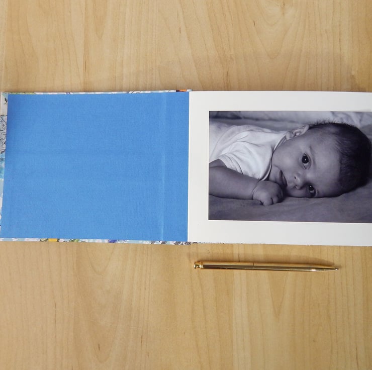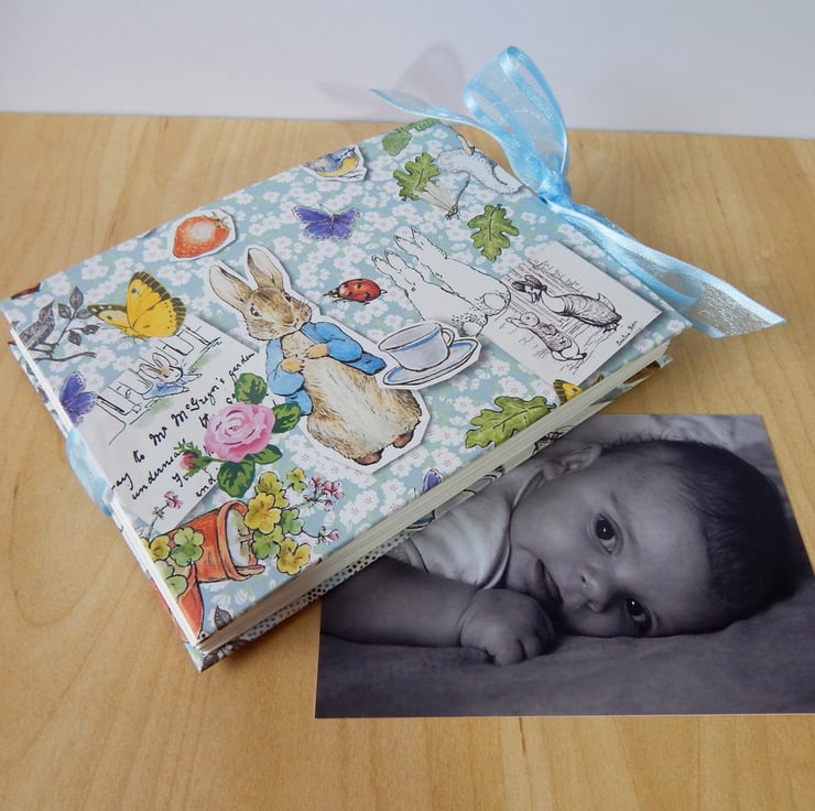 A Baby Photo Album with Peter Rabbit pattern paper covers and blue organza ribbon tie. Will take 7"x 5", 6" x 4" and other popular sizes of photos.