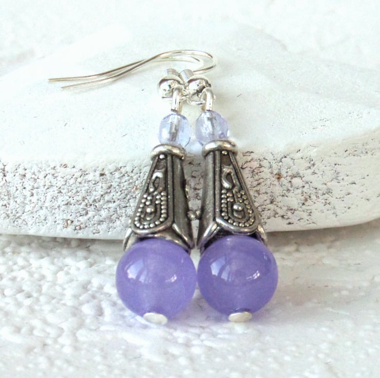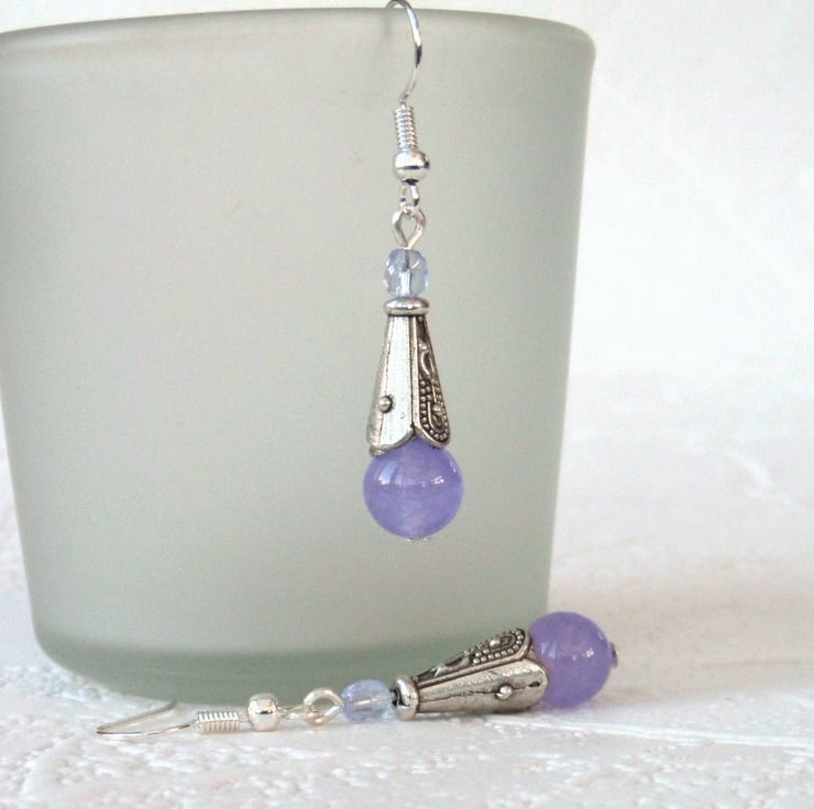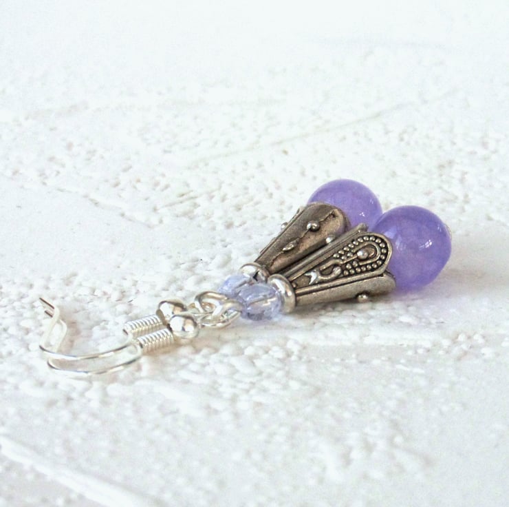 A lovely shade of jade, in a pretty pastel purple, hang with tibetan silver elongated beadcaps and a lovely pale lilac crystal.