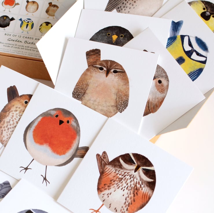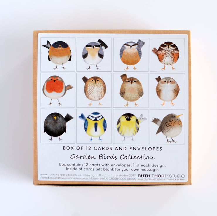 Printed on card from sustainable sources. The cards and natural kraft envelopes are presented in a card box with printed top which represents the 12 designs.