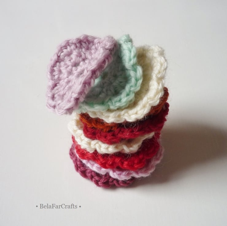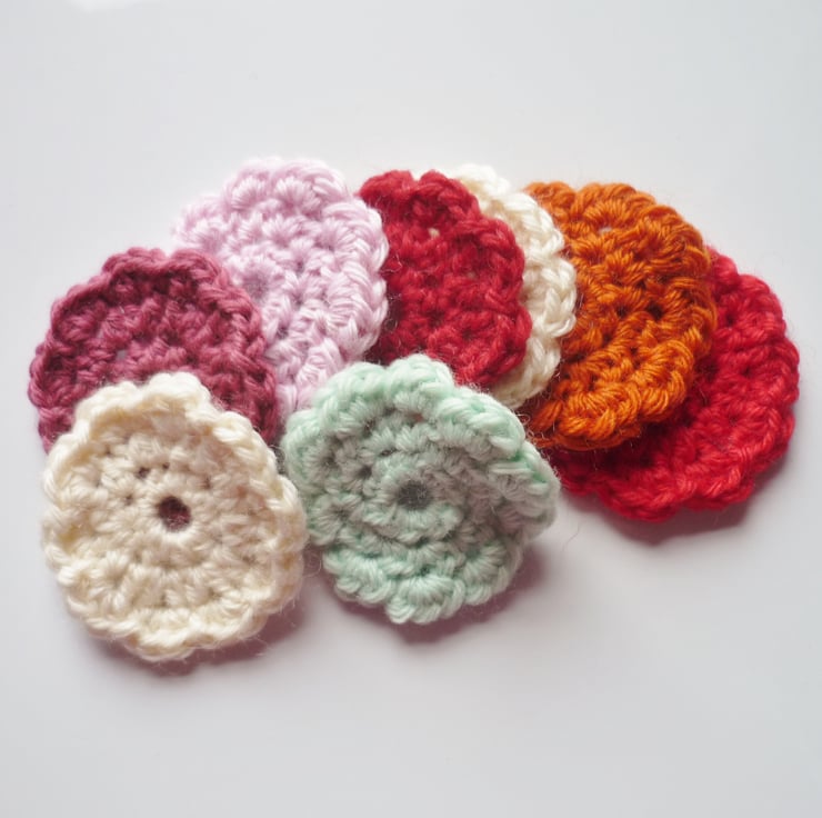 They measure about 4.5cm (shy of 2in). They are hand crocheted in wool blend yarns in cream, pumpkin, mint, red and pink shades. They come in a set of 9.