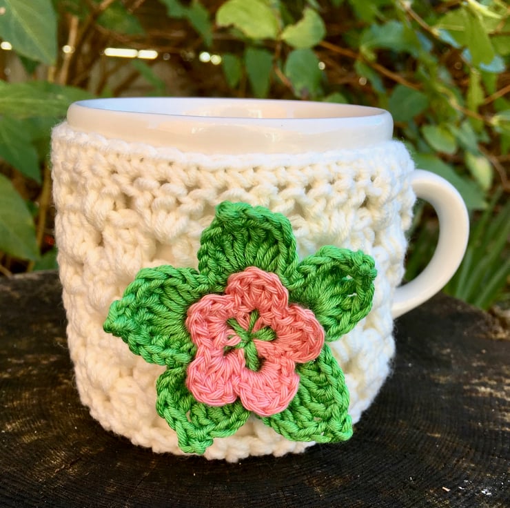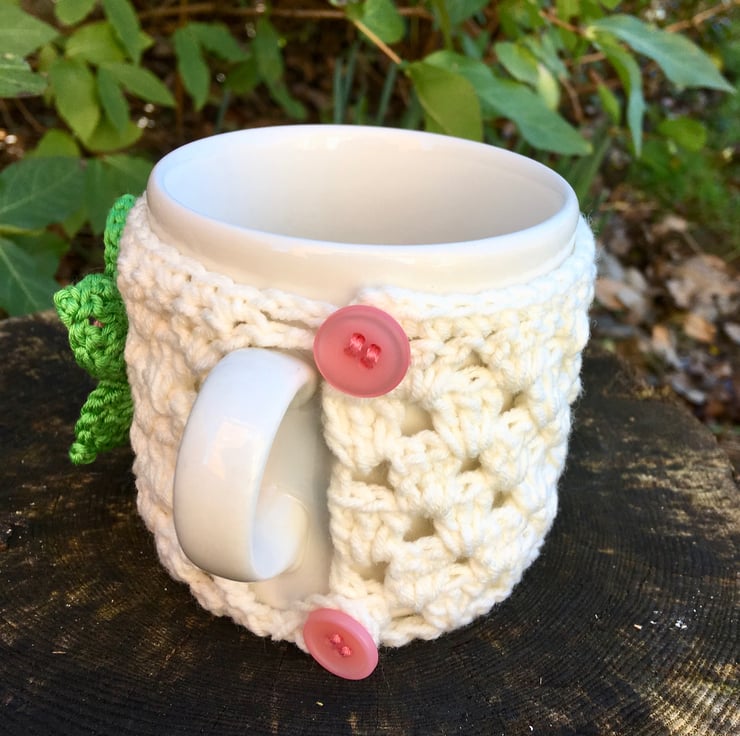 I have made this using a lovely cotton/acrylic mix yarn in cream. The crochet flower is made using green and coral cotton yarn. There are two pink buttons sewn on for fastening around the mug. It measures approx 25 cm x 7.5 cm and will fit around a standard size mug. There are two crochet loops for easy fastening with the buttons.