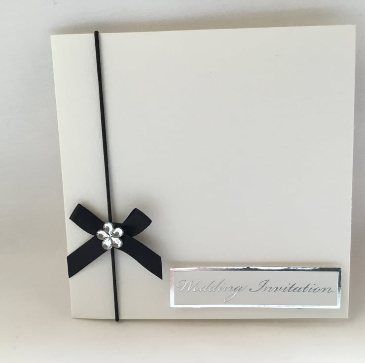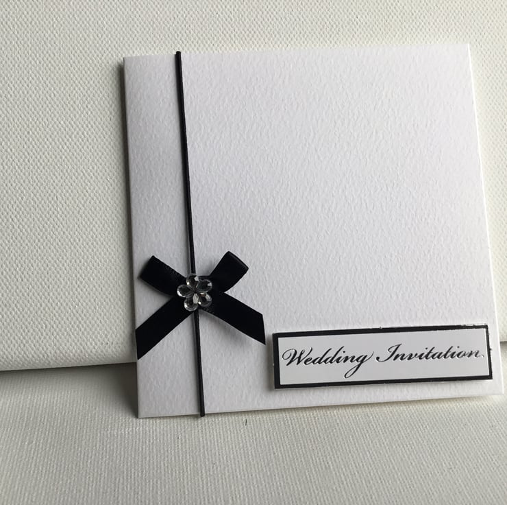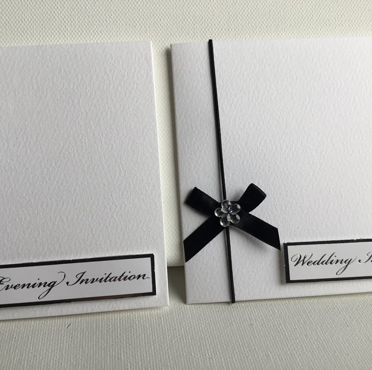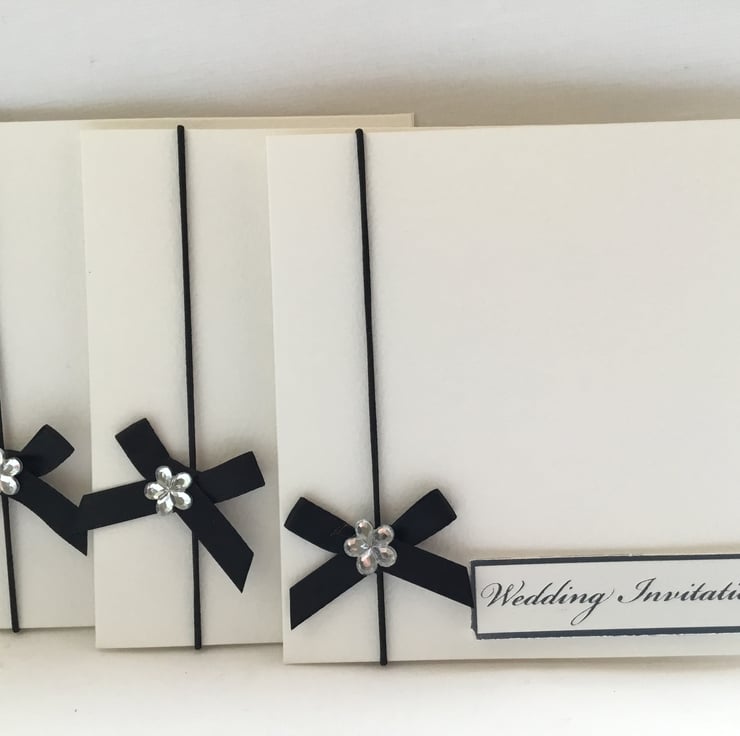 A simple design of 8 wedding invitations featuring a black bow with diamanté detail.