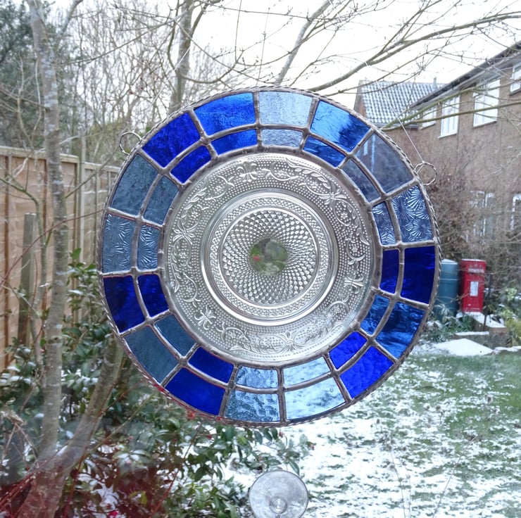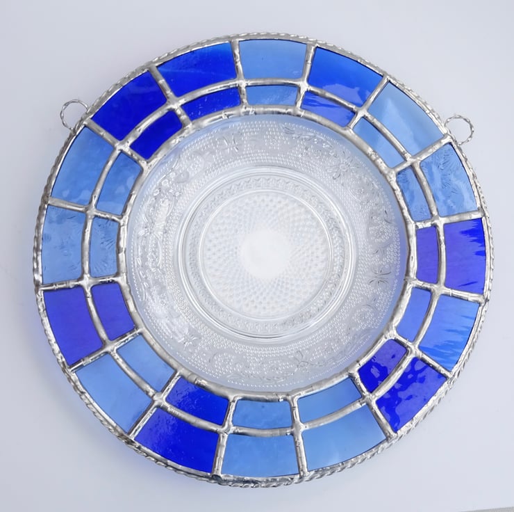 The plate measures 14.5 cms and with the blue glass boarder it measures 23 cms in diameter. The glass boarder is made from 8 different types of blue stained glass, each piece has been hand cut, ground, foiled and then soldered together. I have twisted wire and soldered around the edge to give both extra strength and decoration.