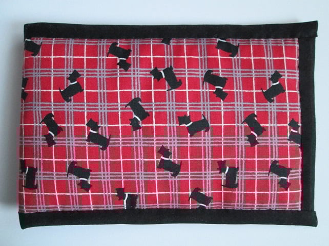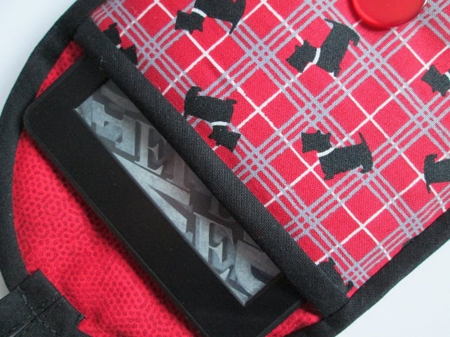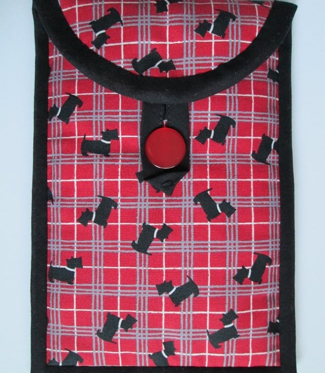 A smart, soft case for your Kindle or 7" Tablet, featuring a red cotton plaid scattered with small black Scottie dogs. Lightly wadded for protection with a layer of interfacing to the interior for structure, I've used a coordinating red print for the lining. Entirely hand sewn, the case is edged with black cotton bias binding and finished with a button and loop fastening.