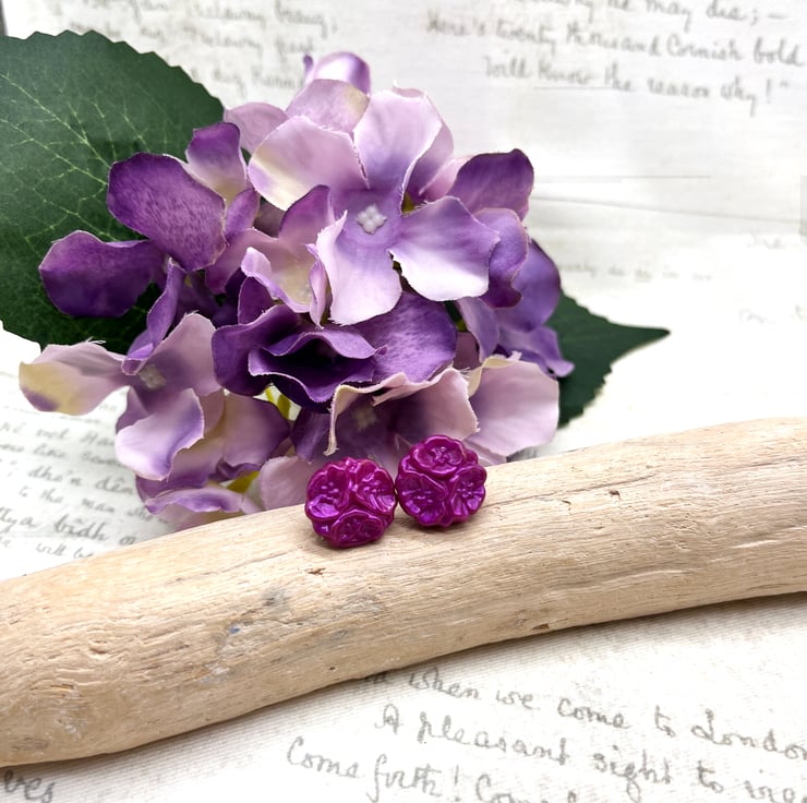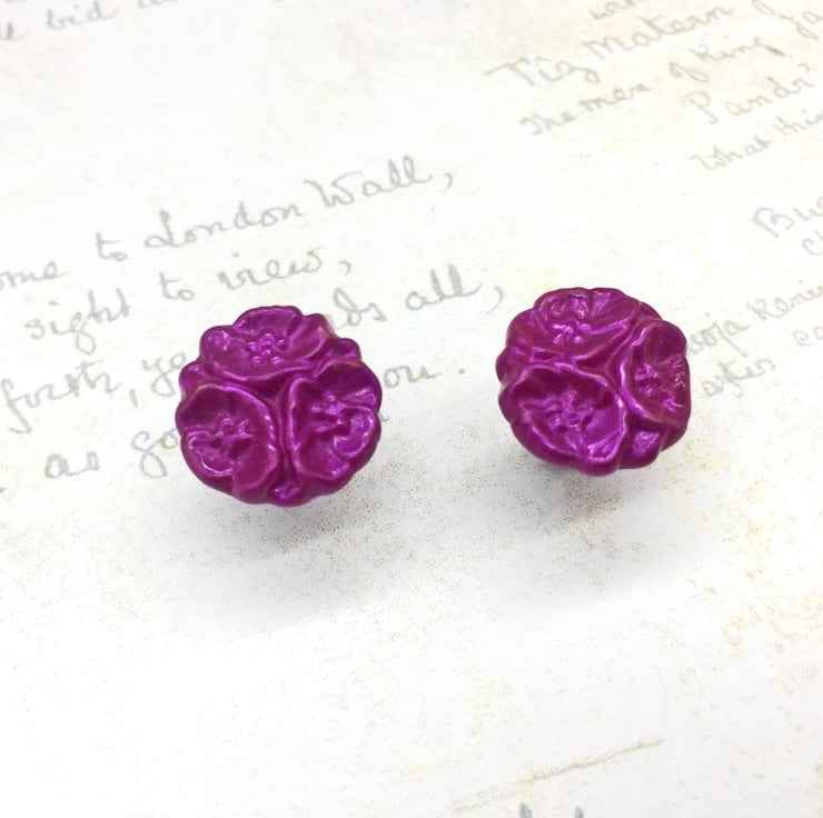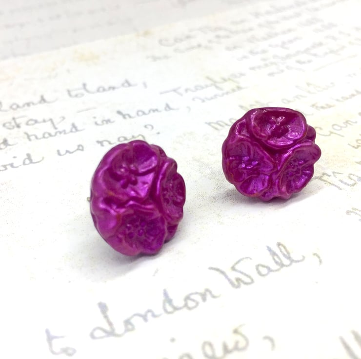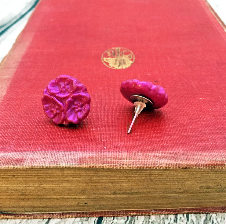 For these earrings I created a silicone mould from a genuine vintage glass flower button from my personal collection, then created my own hot pink or fuchsia pink colour of Embossing enamel combining pink UTEE plus pink mica powder to create a glistening swirled hot pink colour. once set, I brought out the texture and fine detail of the flower ever so slightly with just a touch of pink gilding wax and finally added a clear acrylic varnish over the top.