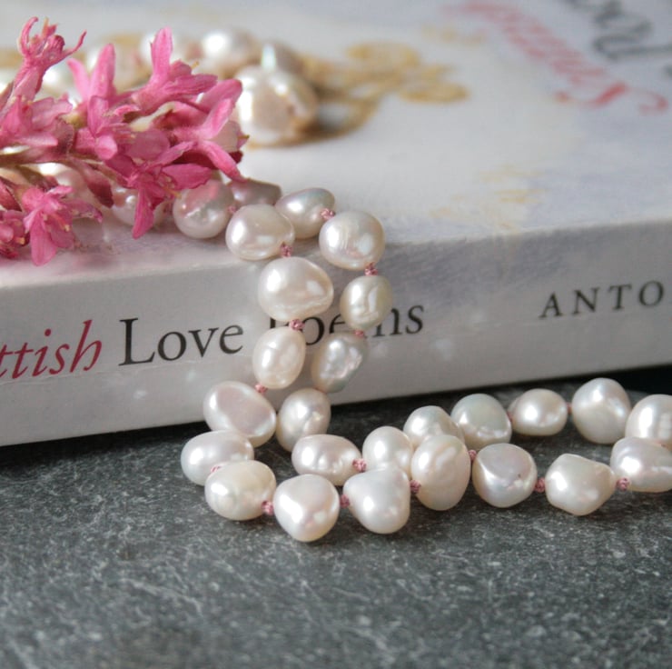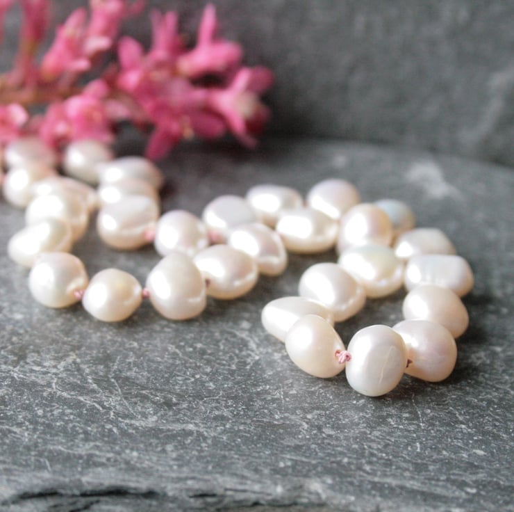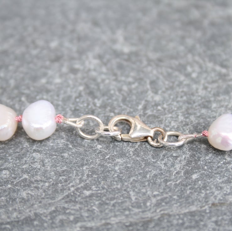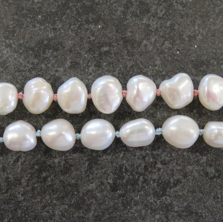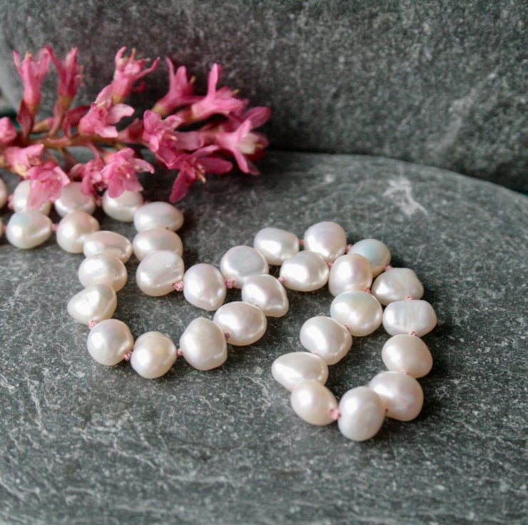 Using silk thread I have hand knotted between each pearl, this prevents the pearls from rubbing against each other and damaging their surfaces. Knotting between each pearl also allows the necklace to fall nicely when being worn. The necklace is finished off with a sterling silver clasp and the total length of the necklace is 18 inches.