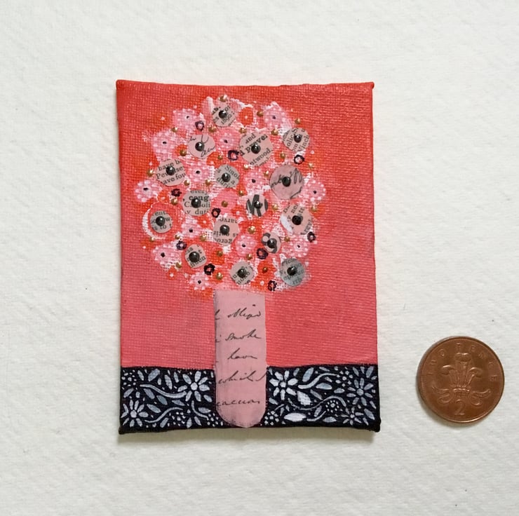 This miniature painting is on a canvas board which measures 4x3 inches, 10x7.5 cm. It is an acrylic and collage painting. It comes unmounted and unframed allowing you to choose a frame in your own style, or it could be propped on a shelf or mantelpiece as it is.