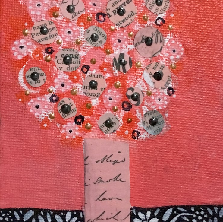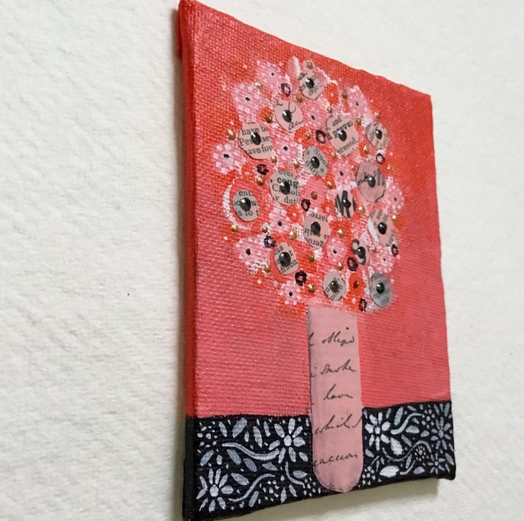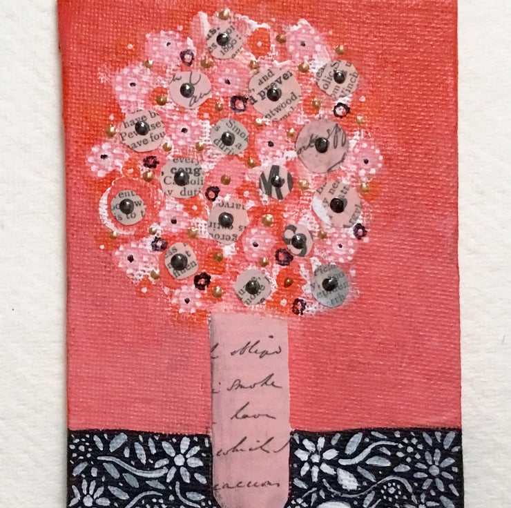 This miniature painting is on a canvas board which measures 4x3 inches, 10x7.5 cm. It is an acrylic and collage painting. It comes unmounted and unframed allowing you to choose a frame in your own style, or it could be propped on a shelf or mantelpiece as it is.