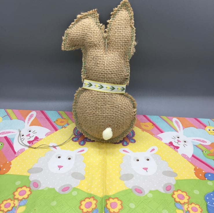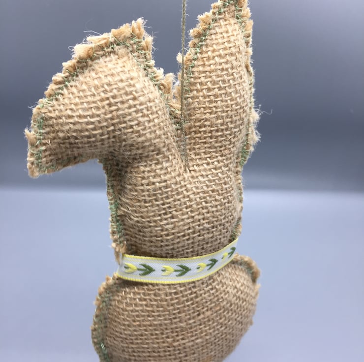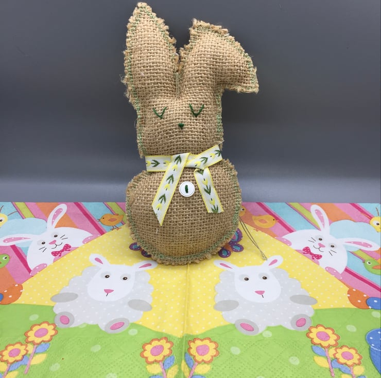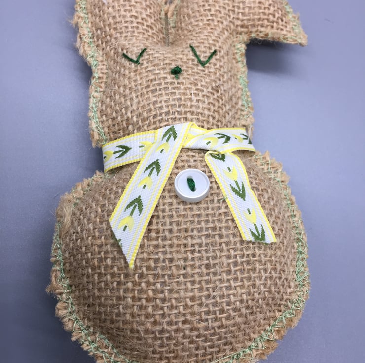 Made of hessian and lightly stuffed. Hand embroidered eyes and nose. Has a natural frayed look Yellow and green floral ribbon to neck, small white button to front and green machine stitching to edge. Cream small pom pom for tail.