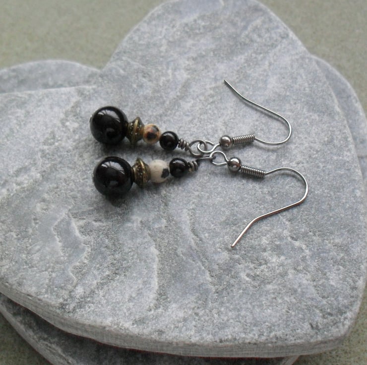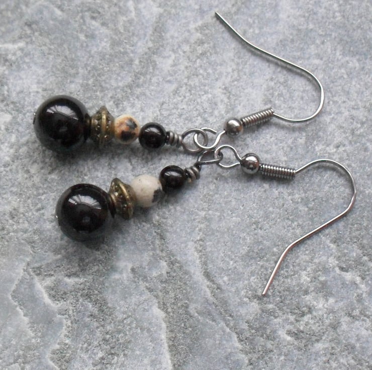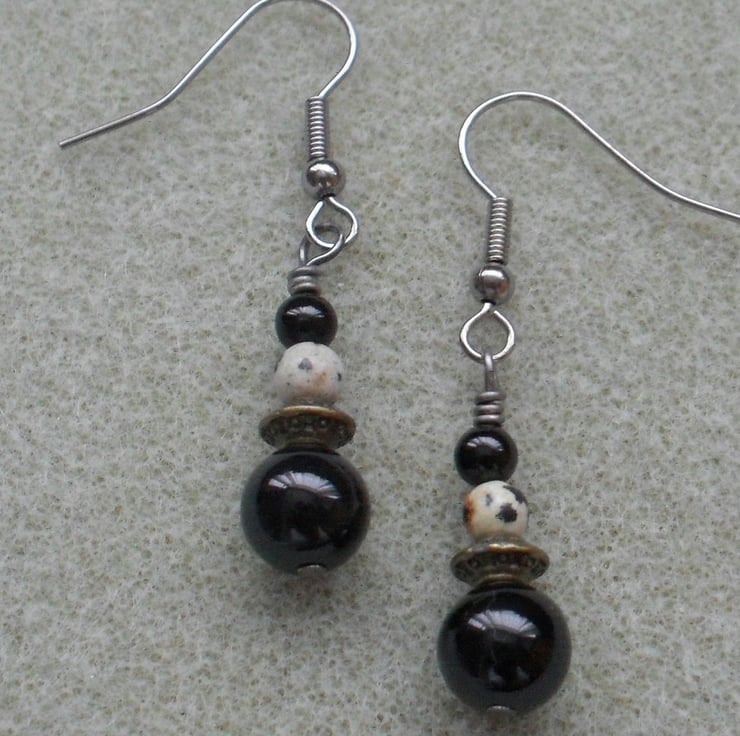 Black agate and dalmatian jasper with antique bronze tone spacer beads are attached to black tone ear wires