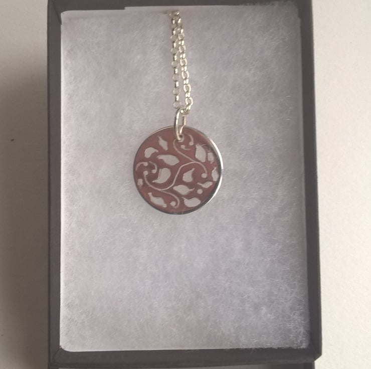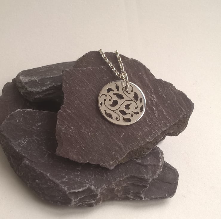 A floral design has been cut out of a 20 mm silver disc.It has been hung on a 45 cm belcher chain by a silver jump ring.