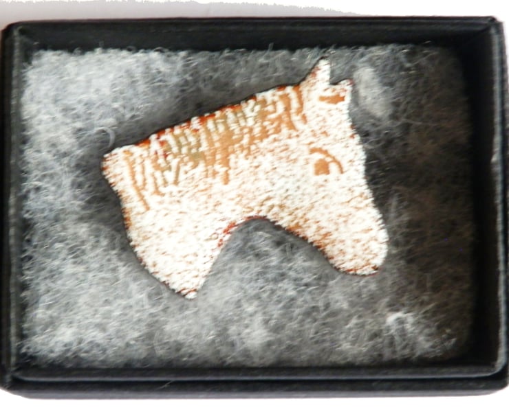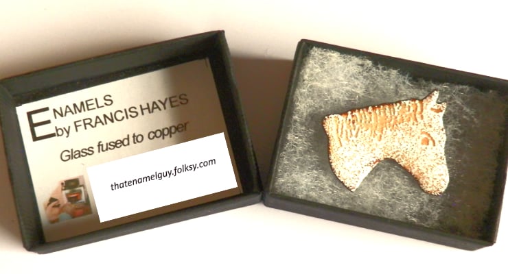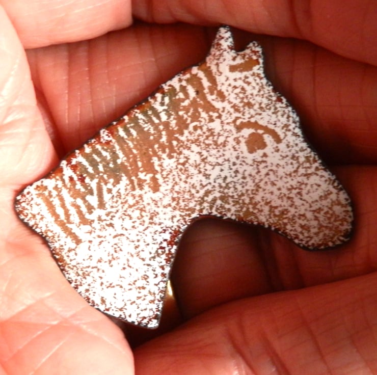 After building a base of several layers of clear enamel on the copper shape I added a layer of white. Before I fired the white layer I drew in the features of the horse, These show through the white, golden-brown from the copper beneath.