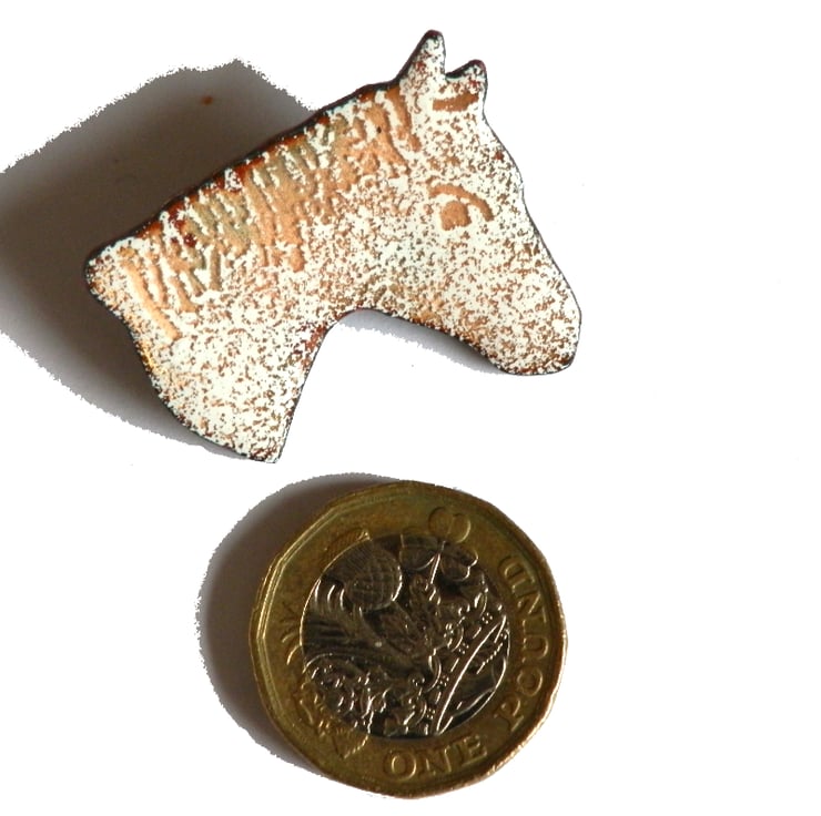 The horse-head measures 32mm by 28mm at its deepest and widest. I have soldered a 26mm brooch bar to the copper. The pin secures with a rotating catch.