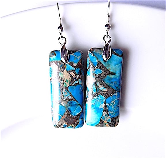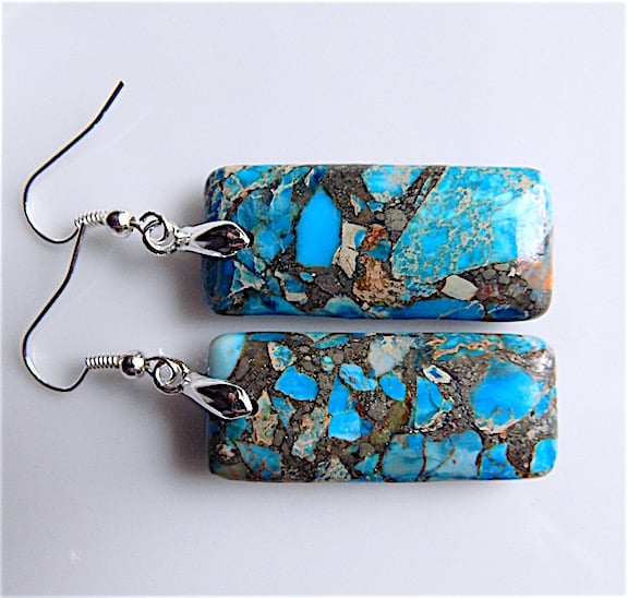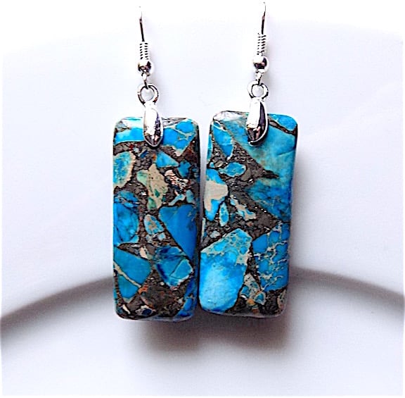 Beautiful gem stone earrings, length 58 mm ( 5.8 cm ) azur blue sea sediment jasper 35 X 15 mm, depth 6 mm, pinch bail and all findings silver plate. Last image is back view of earrings. would match up with azur blue sea sediment jasper necklace for a complete look, just stunning and unique.