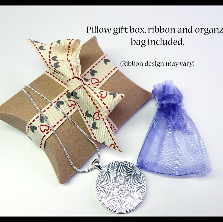 Silver plated pendant supplied with a silver plated 18" snake chain, a pillow gift box, ribbon, and pouch.