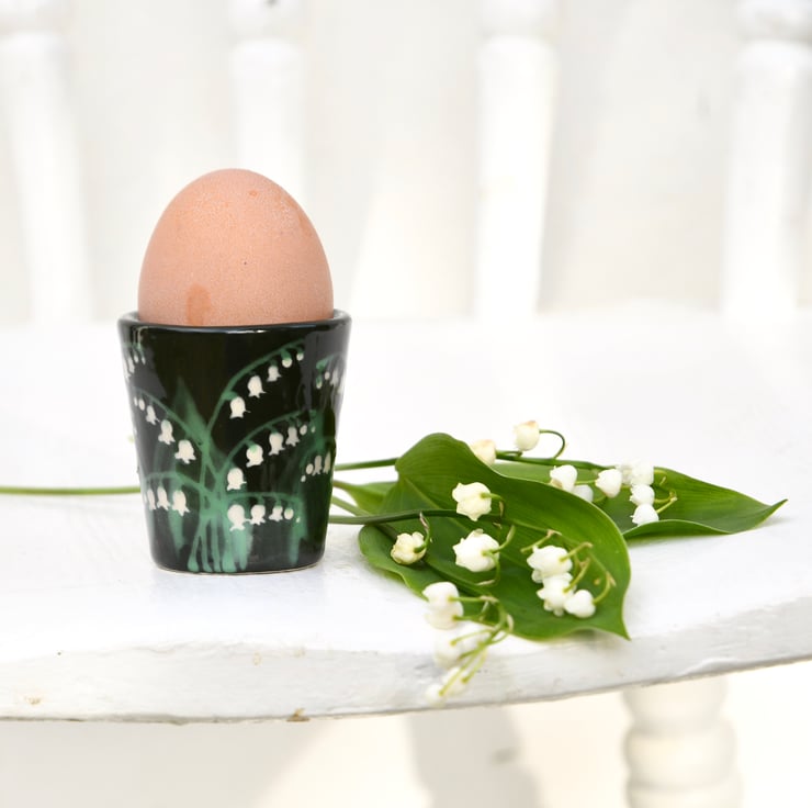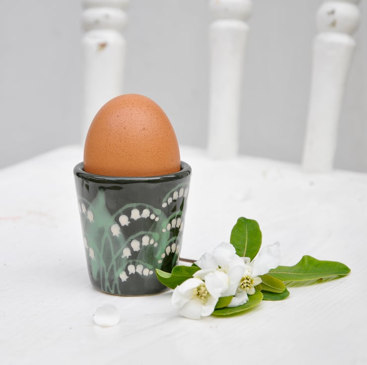 The Lily of the Valley Egg Cup design with its beautiful, dark green background and its tiny off white flowers is both unusual and striking.