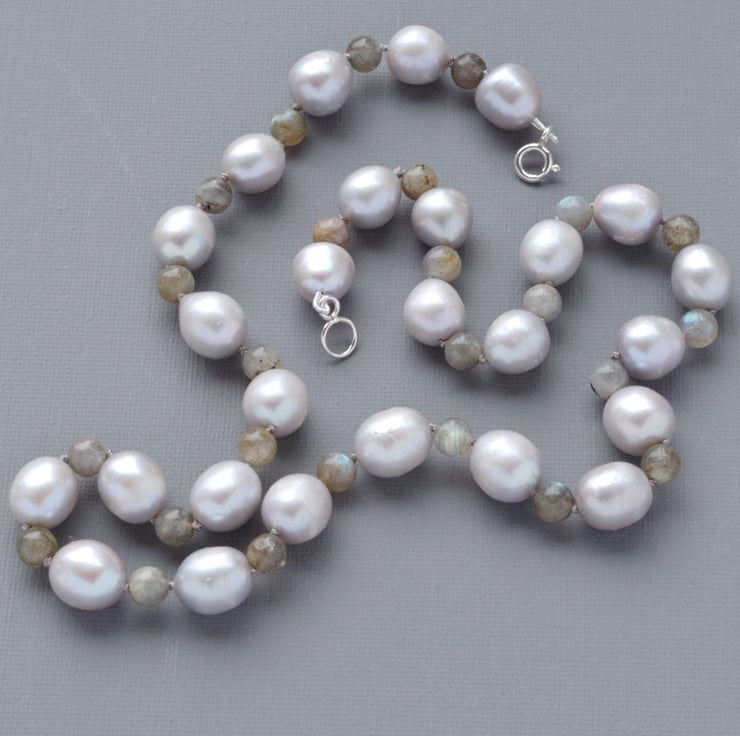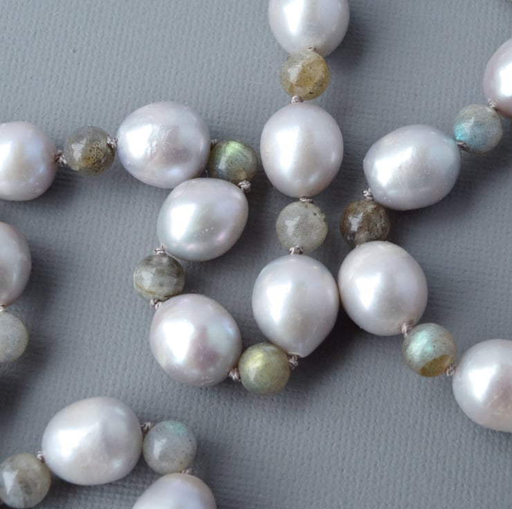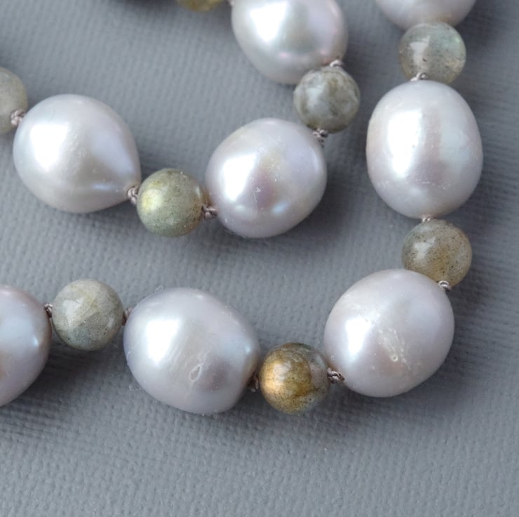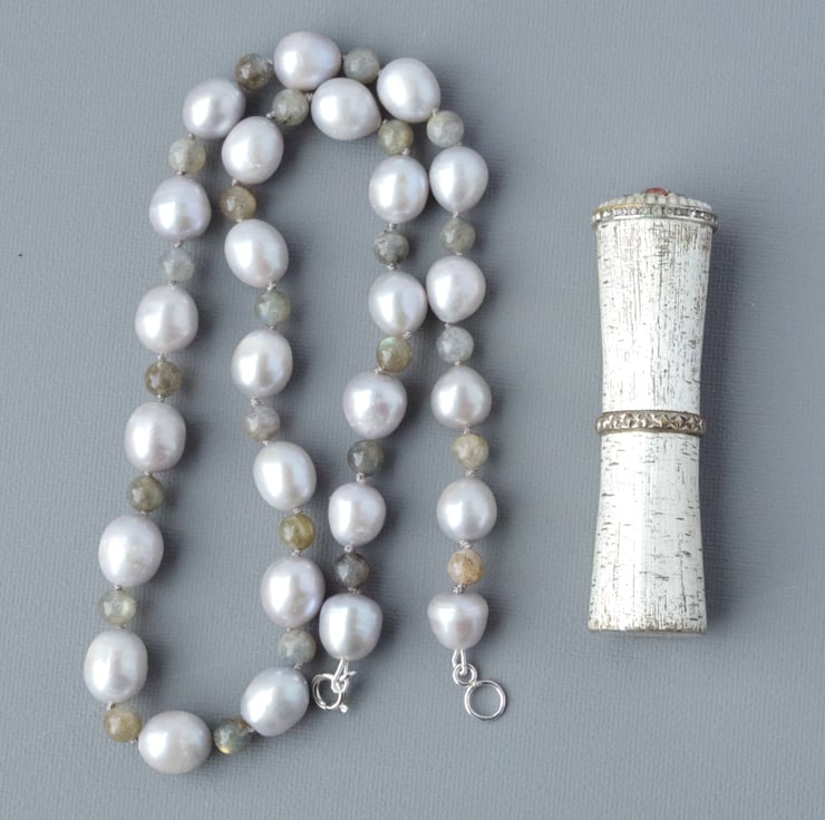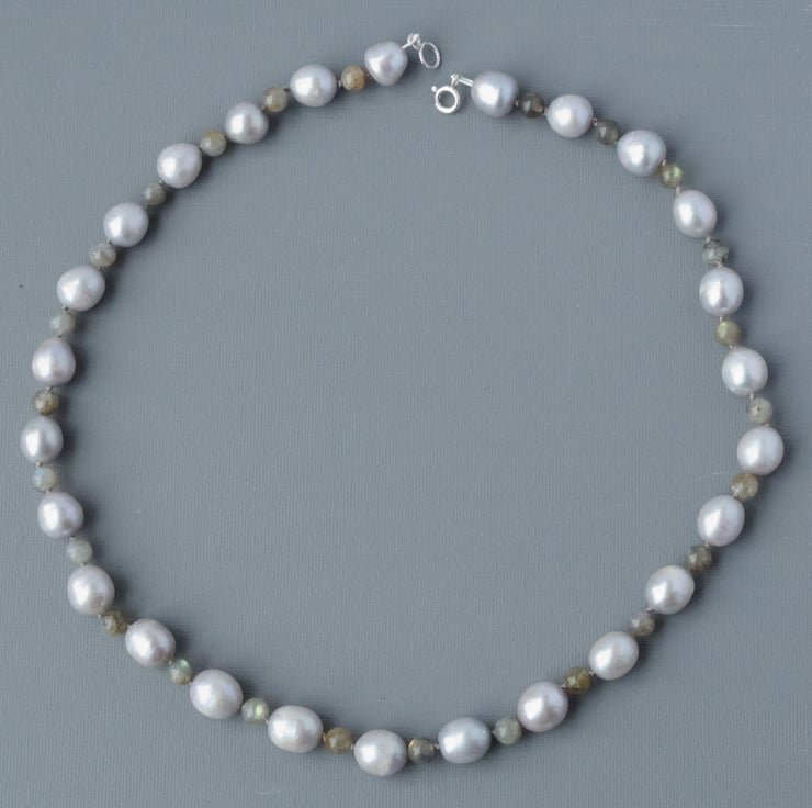 This necklace features marvelous combination of two grey gemstones, each with its own special characteristics, and hand-knotted in the traditional manner on matching grey thread. Hand tying on silk, with a knot between each bead, provides the necklace with incredible drape and feels wonderful to wear. The pearls I have used for this luxurious and unusual necklace are extremely large 12 mm 3/4" long oval dove grey freshwater pearls. I have alternated each pearl with a marbled natural grey labradorite gemstone bead, which flickers with rainbow coloured flash in the light. The surface of the pearls is so smooth that it reflects back the flash from the labradorite and enhances the whole necklace with subtle colours against the grey. This necklace measures 540 mm in length or 21" and is fastened with a sturdy sterling silver bolt ring clasp with a hand forged tab made by me at my workshop in West Sussex.