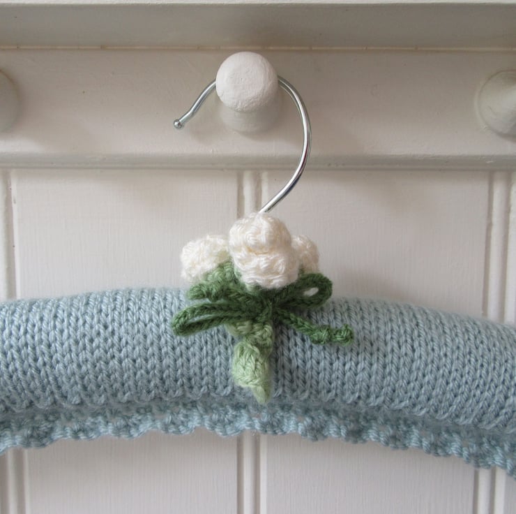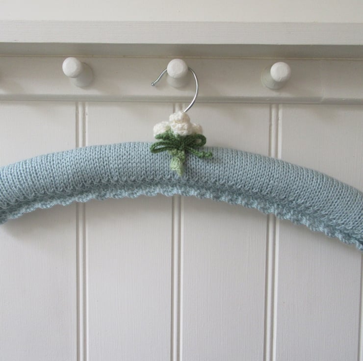 A hand knitted duck egg blue ladies padded coat hanger with cream rose buds. The wooden hanger is generously wrapped in polyester wadding producing a well padded dress hanger. The cover is hand knitted in duck egg blue coloured yarn. There is a beautifully delicate knitted lace picot edging which compliments the few rows of lace stitch on each side, back and front. Under the metal hook are three tight florabunda cream rose buds, with the palest of green sepals and stem, all tied together using a handmade cord in a forest green coloured yarn.