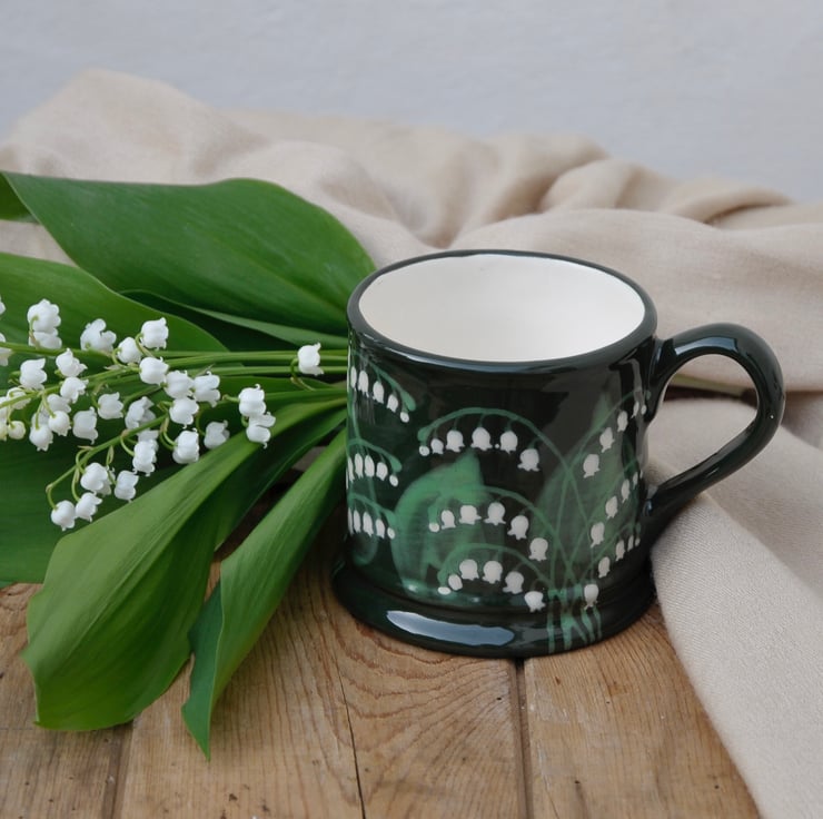 Lily of the Valley Country Mug is hand painted with a deep green background to show off those delicate pale cream flowers
